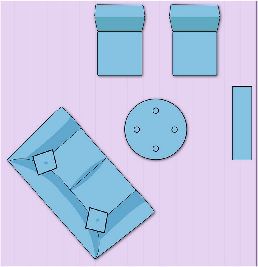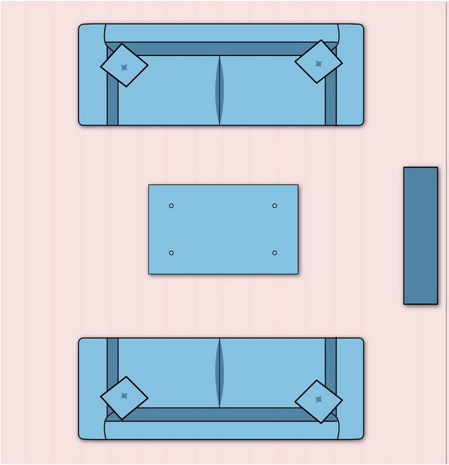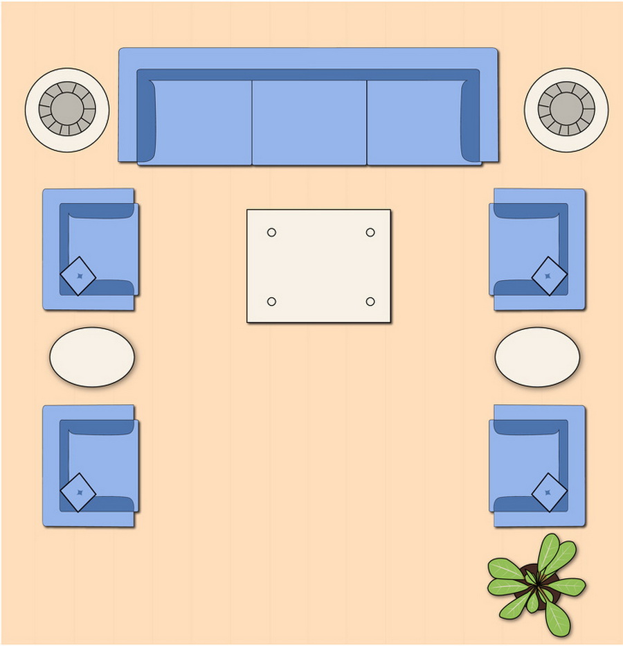 โดยการจัดห้องรูปแบบนี้จะมีโต๊ะกาแฟเป็นจุดศูนย์กลางเสมอ จากนั้นจึงวางโซฟา หรือเก้าอี้ไว้ล้อมรอบ