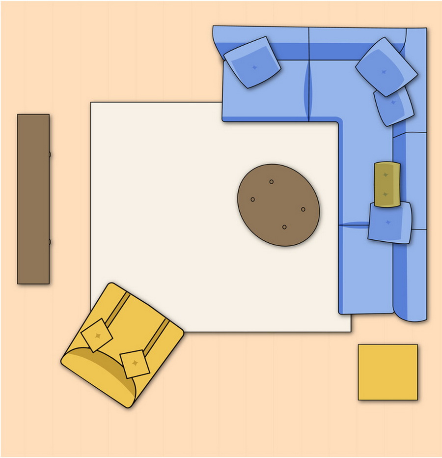 การจัดห้องรูปแบบนี้จะเน้นไปที่การเลือกเฟอร์นิเจอร์ที่จะถูกจัดวางในรูปแบบตัวแอล ทำให้มีพื้นที่ใช้งานที่ค่อนข้างกว้าง