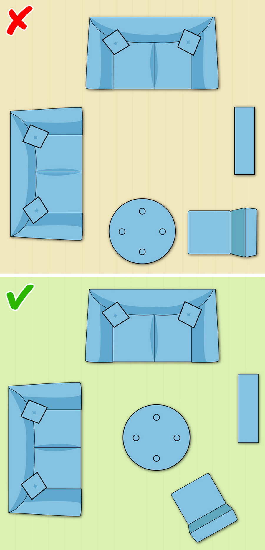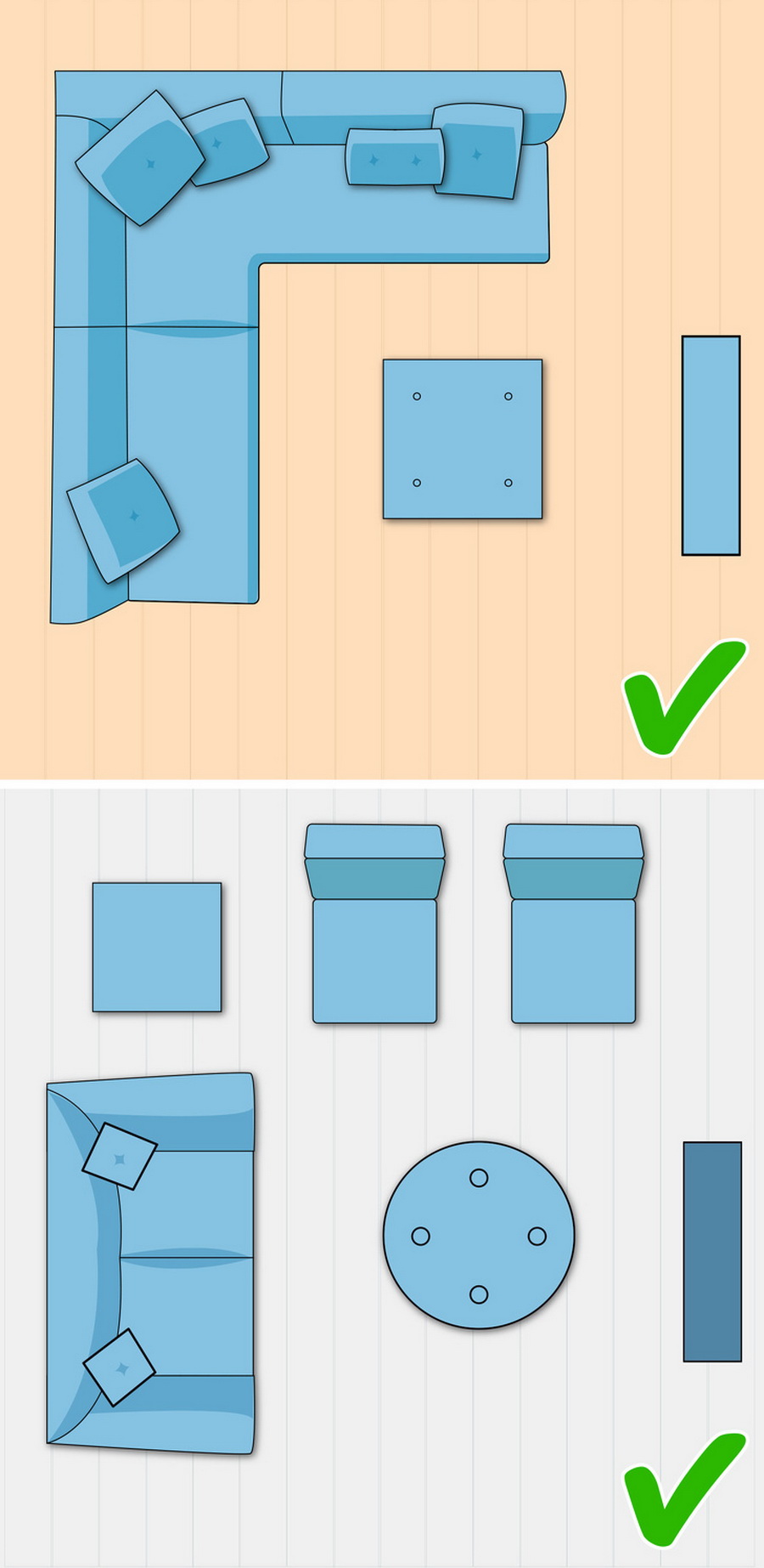 โดยเริ่มจากการเลือกจักวางเฟอร์นิเจอร์ชิ้นใหญ่อย่างโซฟาทั้งตัวใหญ่และตัวเล็ก โดยให้หันไปพบกับจุดโฟกัสอื่นๆ เช่น ทีวี หน้าต่างเป็นต้น