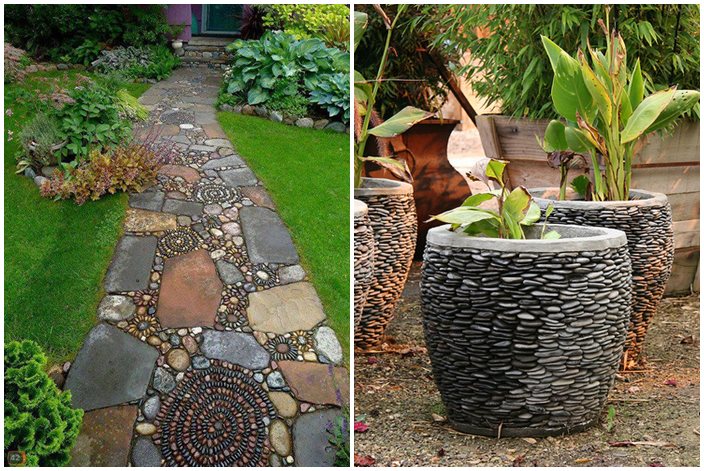ตกแต่งด้วยการนำกรวดมาตกแต่งกระถางดอกไม้ รวมทั้งสิ่งของแต่งสวนอื่นๆ จากการยืดด้วยปูนก็ได้ ดูแปลกตา