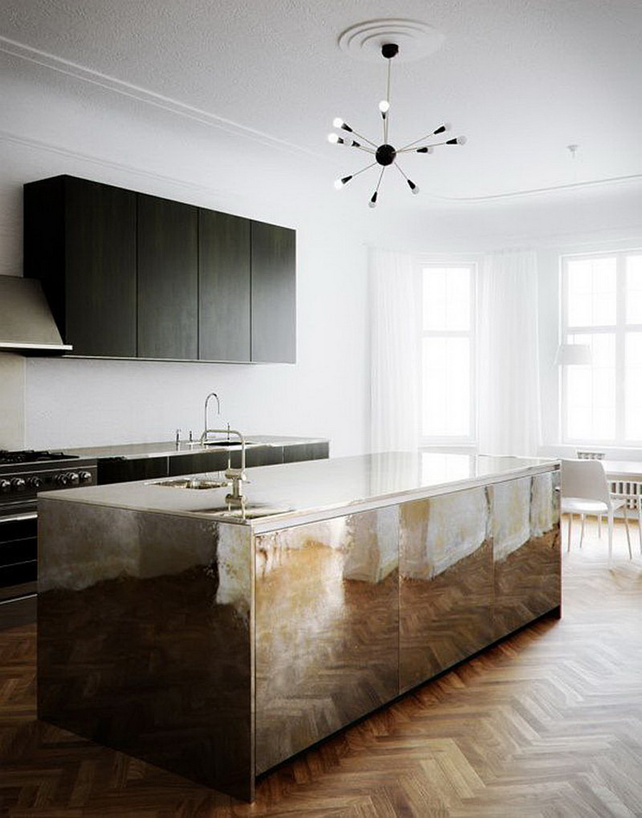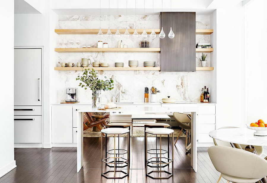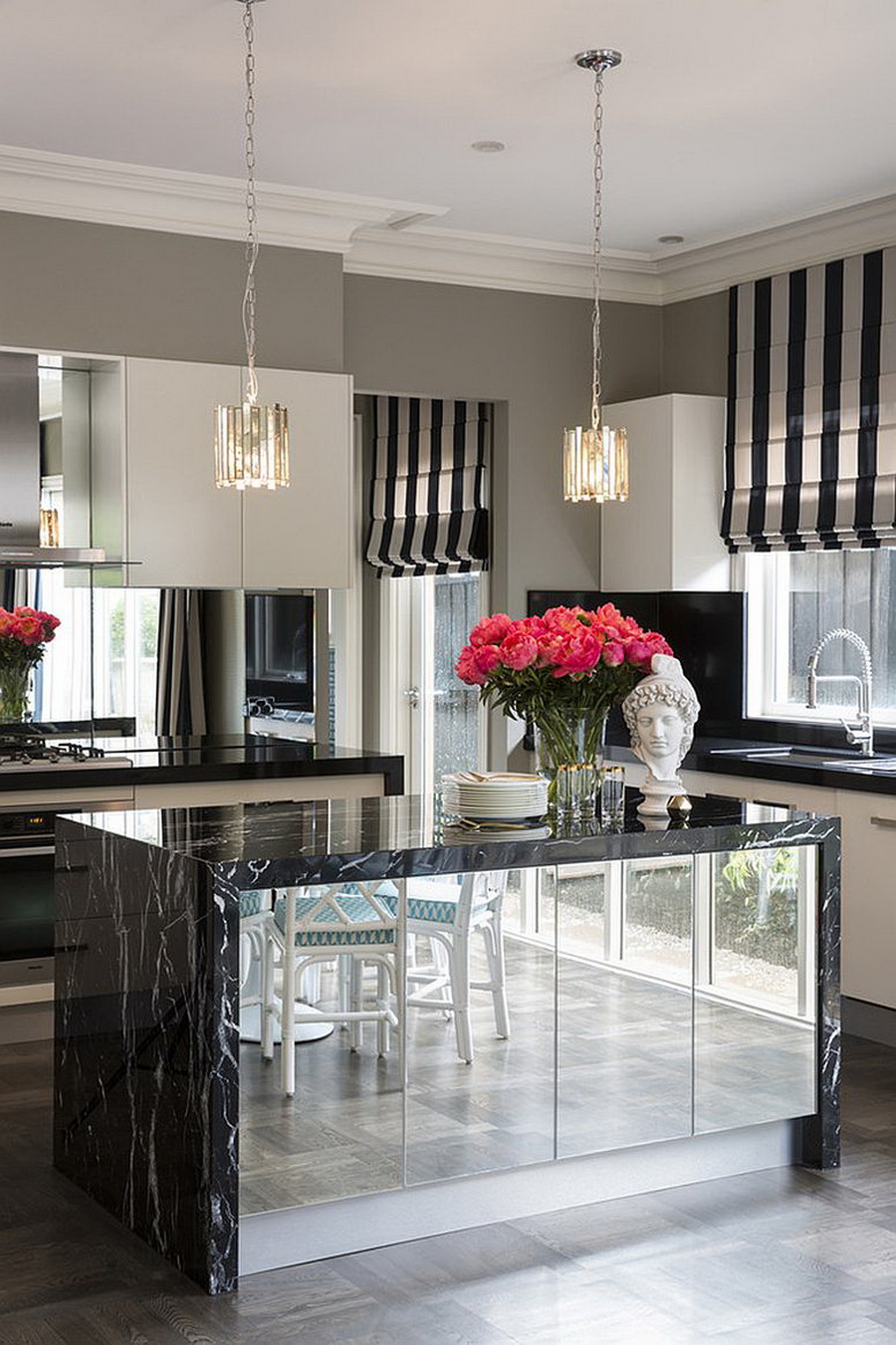 วัสดุอย่างหินกับหินอ่อน เป็นวัสดุยอดนิยมในการใช้ตกแต่งภายในบ้าน โดยเฉพาะในส่วนของเคาน์เตอร์ครัวที่ช่วยเพิ่มความหรูหราให้ห้อง การเพิ่มกระจกเงายิ่งช่วยสร้างมุมมองให้หรูหราและทันสมัยมากยิ่งขึ้น