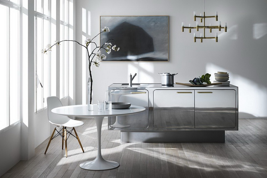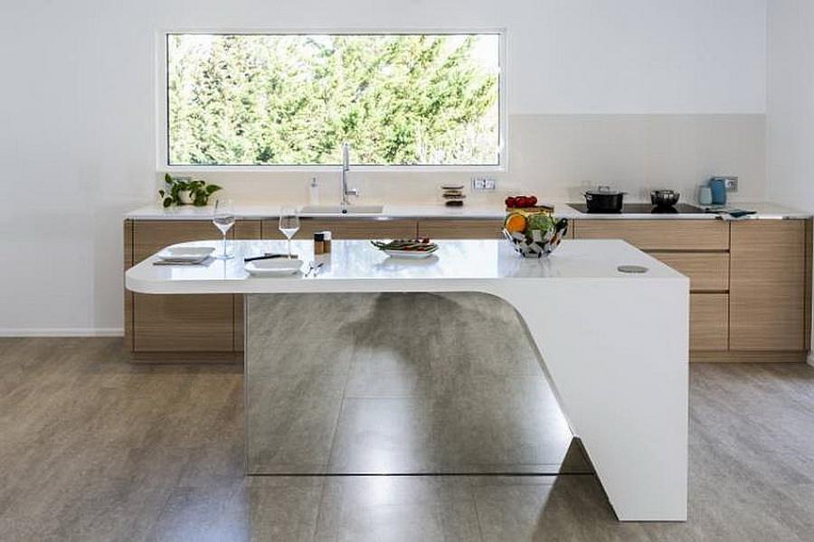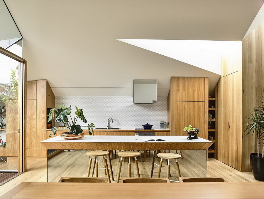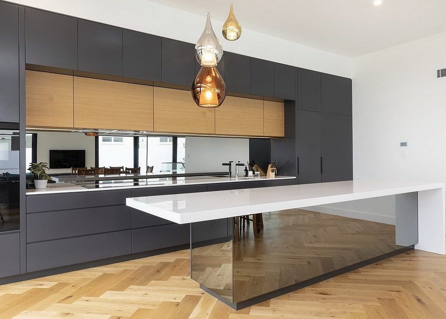 ไม้และสีขาวเป็นโทนสีแบบโมโนโทน เมื่อนำเอากระจกเงามาตกแต่งเคาน์เตอร์ครัวก็จะเกิดภาพสะท้อนที่สวยงาม ให้บรรยากาศที่โปร่งสบายมากยิ่นขึ้น