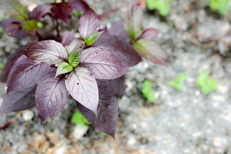 เป็นไม้ล้มลุก มีลำต้นสีแดง เป็นข้อ ๆ สูง 10-15 เซนติเมตร ใบด้านบนมีสีเขียว ถ้าโดนแดดจัด ๆ จะกลายเป็นสีเทาอมเขียว ส่วนใบด้านล่างเป็นสีแดง มีดอกออกเป็นช่อ สีขาว
