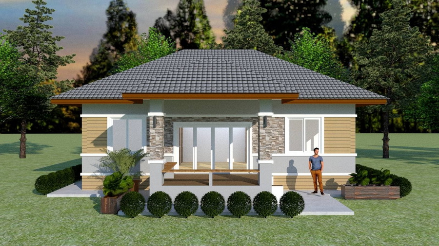 ลักษณะบ้านชั้นเดียว ตัวบ้านมีหน้ากว้าง ออกแบบดีไซน์ด้วยสไตล์แบบคอนเทมโพรารีที่มีหลังคาทรงปั้นหยาแบบเล่นระดับที่มุงด้วยกระเบื้องลอนสีอ่อน ผนังภายนอกผสานการตกแต่งระกว่างสีขาวครีม สีเทาและสีน้ำตาลอ่อน ทำให้ตัวบ้านมีบรรยากาศที่อบอุ่น