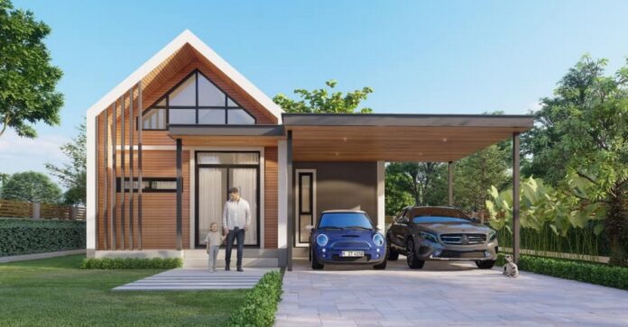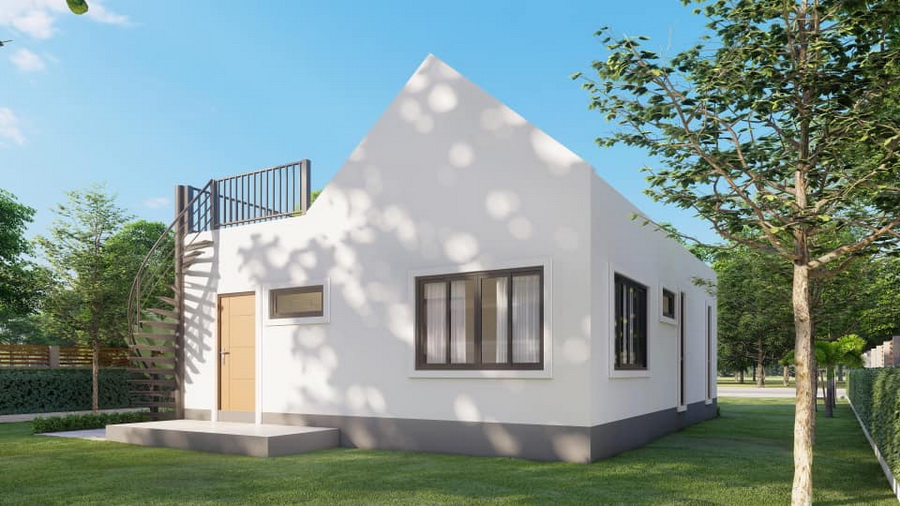 แบบบ้านชั้นเดียวสไตล์มินิมอล 2 ห้องนอน 2 ห้องน้ำ 1 ห้องรับแขก 1 ห้องครัว พร้อมชั้นดาดฟ้า สามารถจอดรถได้ 2 คัน รวมพื้นที่ใช้สอยกว่า 100 ตารางเมตร งบก่อสร้างอยู่ที่ประมาณ 1.8 ล้านบาท