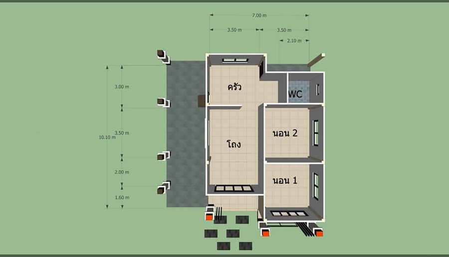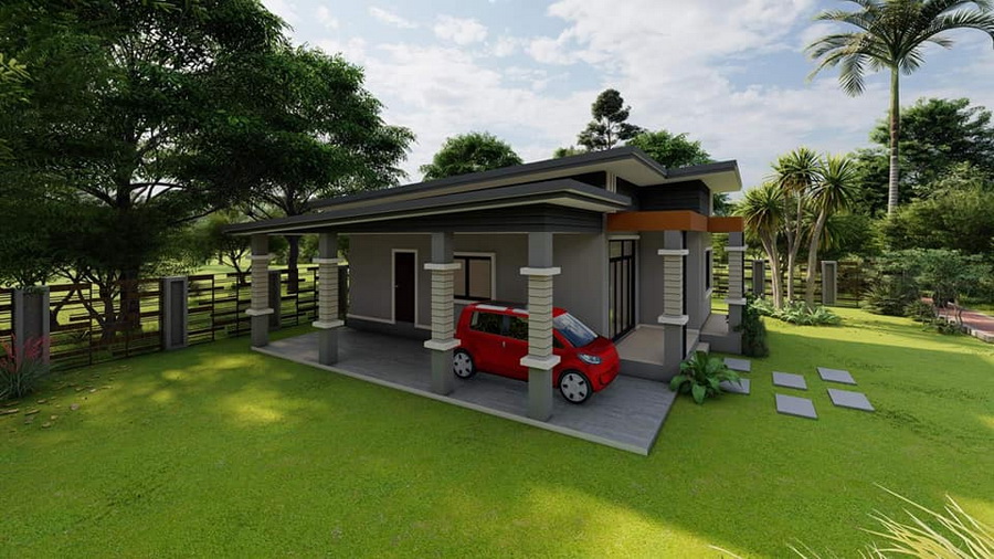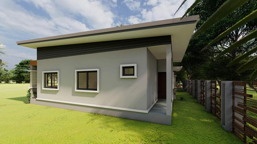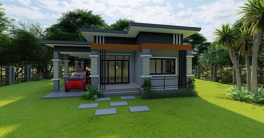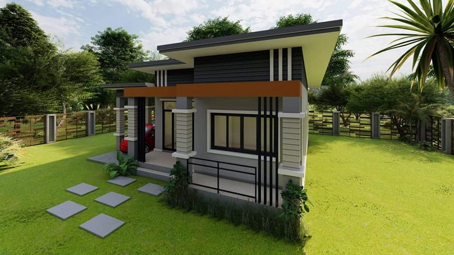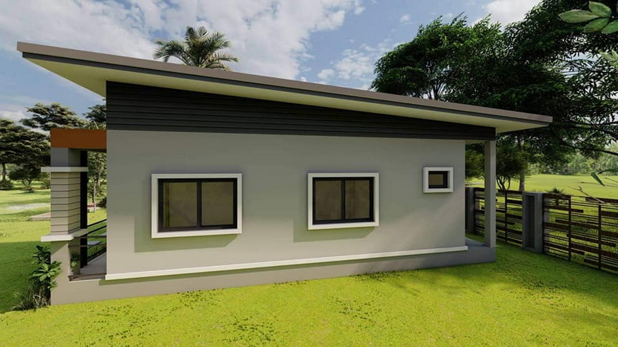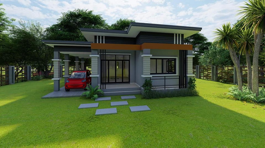 แบบบ้านสไตล์โมเดิร์นหลังนี้ประกอบไปด้วย 2 ห้องนอน 1 ห้องน้ำ 1 ห้องโถงนั่งเล่น 1 ห้องครัว พร้อมพื้นที่จอดรถขนาดใหญ่ พื้นที่ใช้สอยทั้งหมดประมาณ 100 ตารางเมตร ราคาแบบแปลน 3,900 บาท