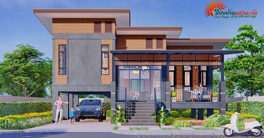 สำหรับบ้านหลังนี้เป็นบ้านขนาดชั้นครึ่ง ตัวบ้านถูกยกใต้ถุนขึ้นสูง จึงให้ความโปร่งสบาย มีพื้นที่ไว้สำหรับจอดรถ โดยตัวบ้านมีดีไซน์ในแบบบ้านโมเดิร์นทั่วไป คือ มีทรงแบบสี่เหลี่ยมที่เรียบง่าย หลังคาทรงเพิงหมาแหงนที่ออกแบบเล่นระดับสวยงามถึงสามชั้น ผนังภายนอกตกแต่งด้วยปูนเปลือยแบบสวยดิบผสมผสานไปกับงานไม้