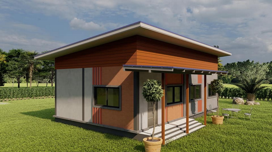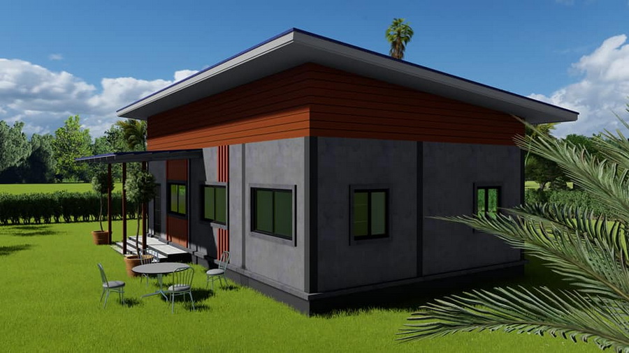 แบบบ้านหลังนี้เป็นบ้านขนาดชั้นเดียว ตัวบ้านถูกออกแบบด้วยสไตล์โมเดิร์น จึงมีรูปทรงสี่เหลี่ยมที่เรียบง่าย งานหลังคาจะเป็นหลังคาแบบเพิงหมาแหงนที่รับกับตัวบ้านในทรงสี่เหลี่ยมได้เป็นอย่างดี ด้านการตกแต่งนั้น ผนังภายนอกมีสองโทนสีอย่างสีเทาและสีน้ำตาลที่ผสานกันอย่างสวยงาม
