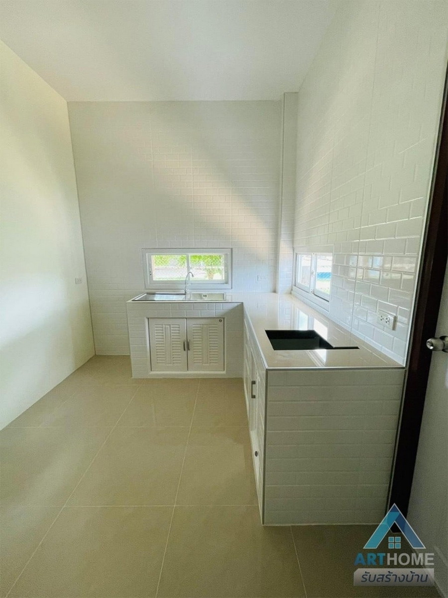 ห้องครัวเป็นอีกห้องหนึ่งที่ออกแบบและตกแต่งอย่างเรียบง่าย แต่ก็มีฟังก์ชันการใช้งานที่ครบถ้วน เน้นโทนสีขาวเพื่อให้ครัวมีความสว่าง