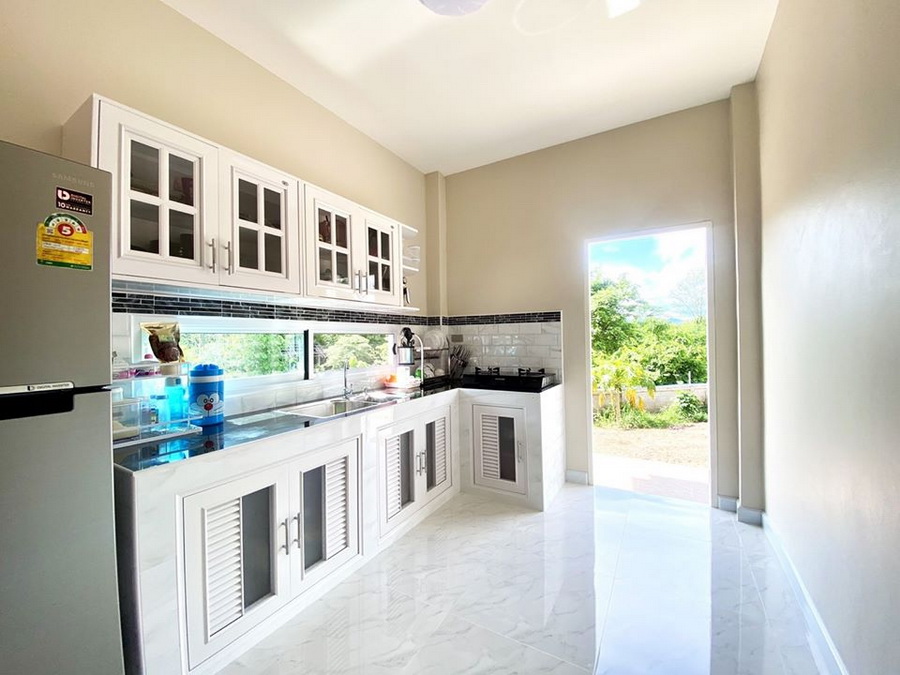 ทางด้านขอห้องครัวเป็นห้องที่ถูกออกแบบให้เน้นความโปร่งสบาย ภายในติดตั้งด้วยเคาน์เตอร์ครัวแบบติดผนังและชั้นเก็บของเหนือเคาน์เตอร์ที่ให้ความสะดวกสบาย