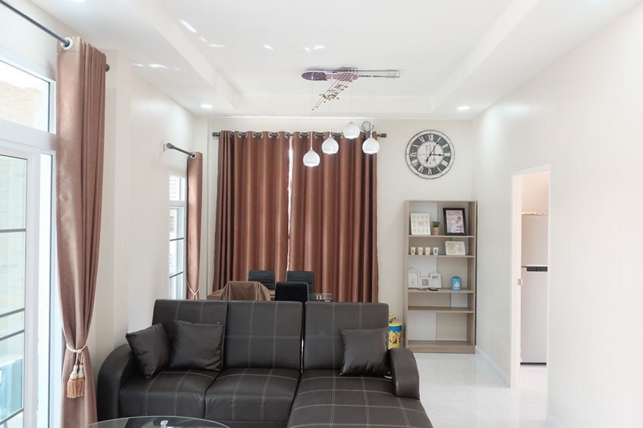 เมื่อเข้ามาภายในบ้าน เราจะพบกับห้องโถงนั่งเล่นขนาดพอเหมาะ ซึ่งตกแต่งด้วยชุดโซฟาหนังสีเข้ม พร้อมกับการตกแต่งผนังในโทนสีขาวสว่าง