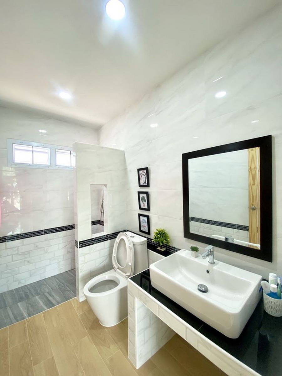 สำหรับห้องน้ำเป็นอีกห้องที่มีพื้นที่ใช้สอยภายในที่กว้างขวาง จึงสามารถแบ่งพื้นที่การใช้งานแบบแห้งและแบบเปียกได้อย่างลงตัว ภายในตกแต่งในโทนสีสว่างที่ให้ความสบายในการใช้งานได้เป็นอย่างดี