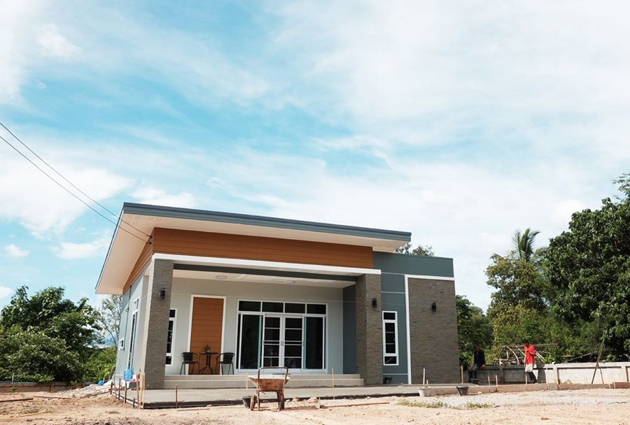 ลักษณะบ้านชั้นเดียว ออกแบบหน้ากว้าง ดีไซน์ของบ้านเป็นรูปทรงแบบโมเดิร์น ตัวบ้านจึงมีรูปทรงสี่เหลี่ยม ด้านการตกแต่งนั้นหลังคาของบ้านเป็นหลังคาแบบเรียบ ผนังภายนอกตกแต่อย่างสวยงามด้วยการผสานการตกแต่งด้วยโทนสีขาว สีเทา สีน้ำตาลและสีฟ้า
