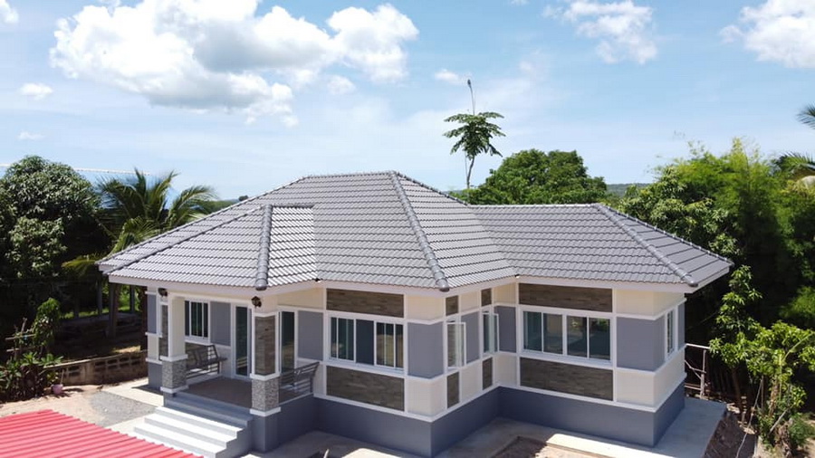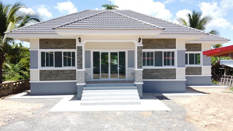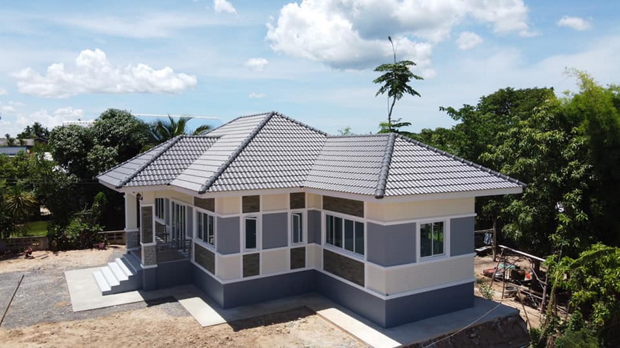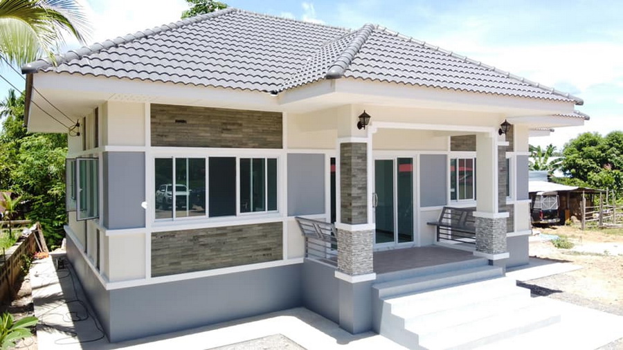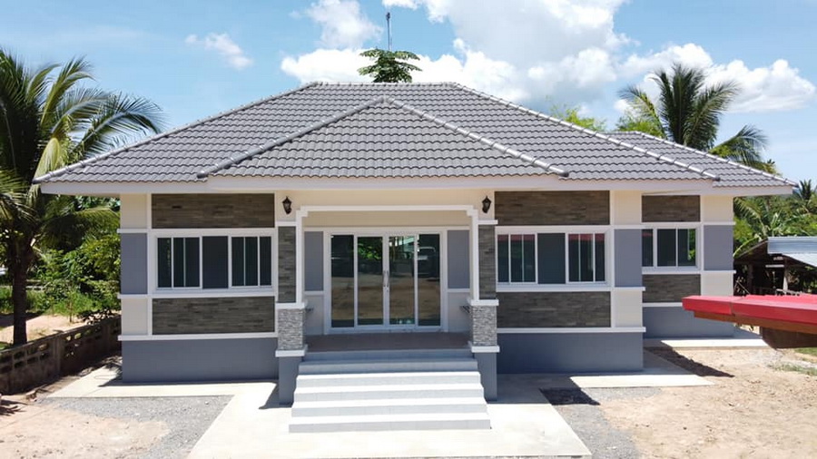 สำหรับบ้านหลังนี้เป็นบ้านขนาดชั้นเดียว ฐานของบ้านถูกยกขึ้นสูง ตัวบ้านมีดีไซน์แบบคอนเทมโพรารีที่เราต่างคุ้นเคยกันดี ด้านการตกแต่งนั้น หลังคาของบ้านมีดีไซน์แบบปั้นหยา มุงด้วยกระเบื้องลอนสีเข้ม ผนังภายนอกเลือกใช้สีเทายืนพื้น เพิ่มดีเทลด้วยสีครีมและสีน้ำตาล