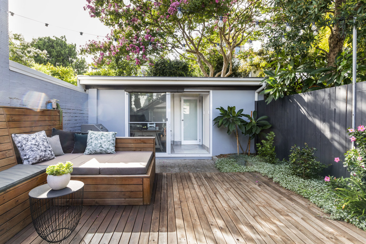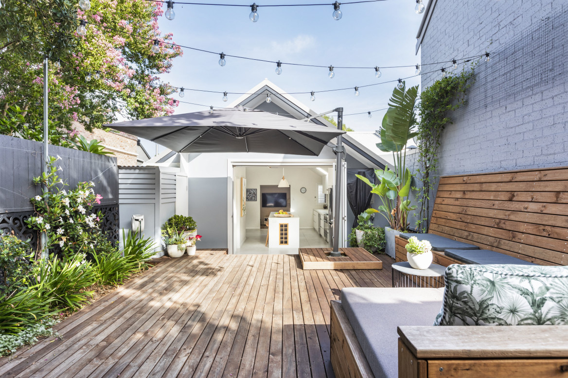 หลังบ้าน เป็นพื้นที่ไฮไลท์ของบ้านหลังนี้ เพราะเป็นลานกว้าง ๆ ที่ปูพื้นด้วยไม้ พร้อมกับการตกแต่งด้วยเฟอร์นิเจอร์เพื่อการพักผ่อนกลางแจ้งโดยเฉพาะ