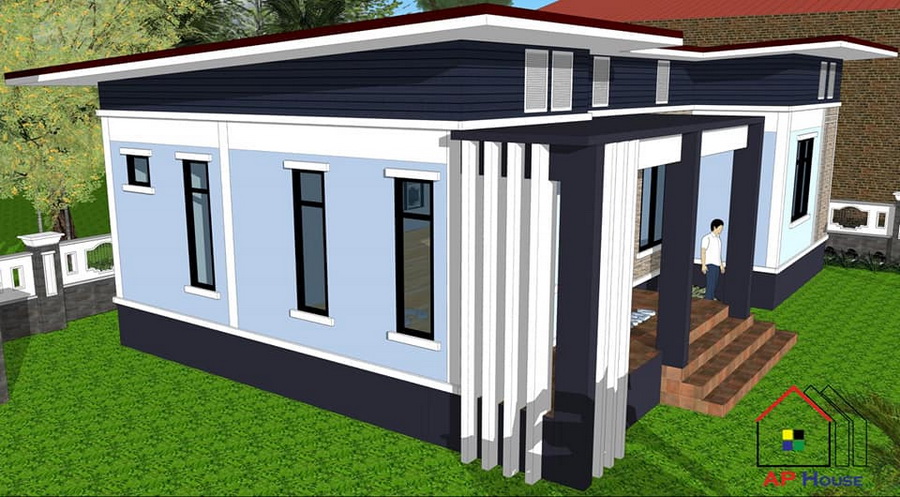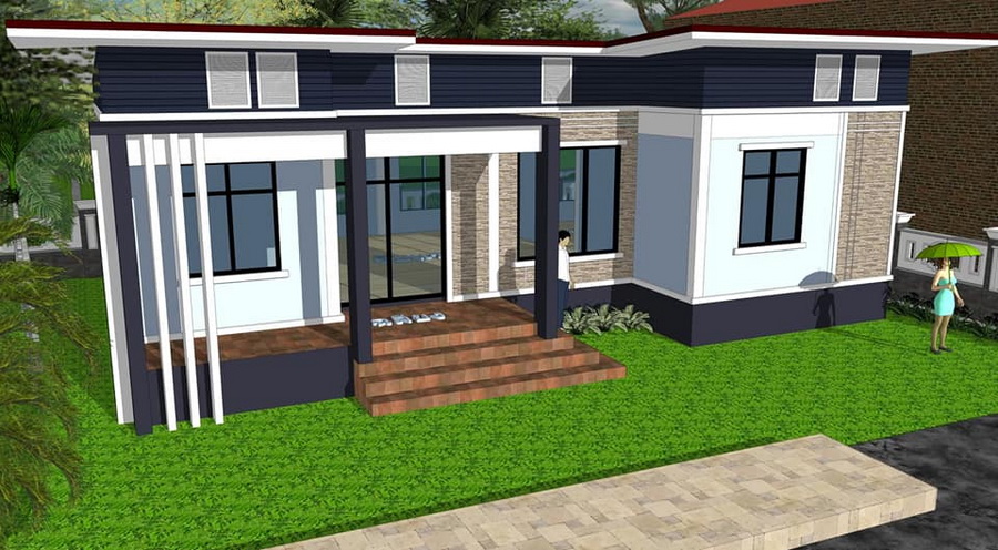 ลักษณะบ้านชั้นเดียว ออกแบบหน้ากว้าง ดีไซน์ของบ้านเป็นแบบโมเดิร์นในทรงสี่เหลี่ยม มีหลังคาทรงเพิงหมาแหงนที่โดดเด่น ด้านการตกแต่งนั้น ผนังภายนอกเลือกใช้โทนสีขาวตัดกับดำ แซมด้วยสีน้ำตาลจากผนังลานหินธรรมชาติได้อย่างลงตัว