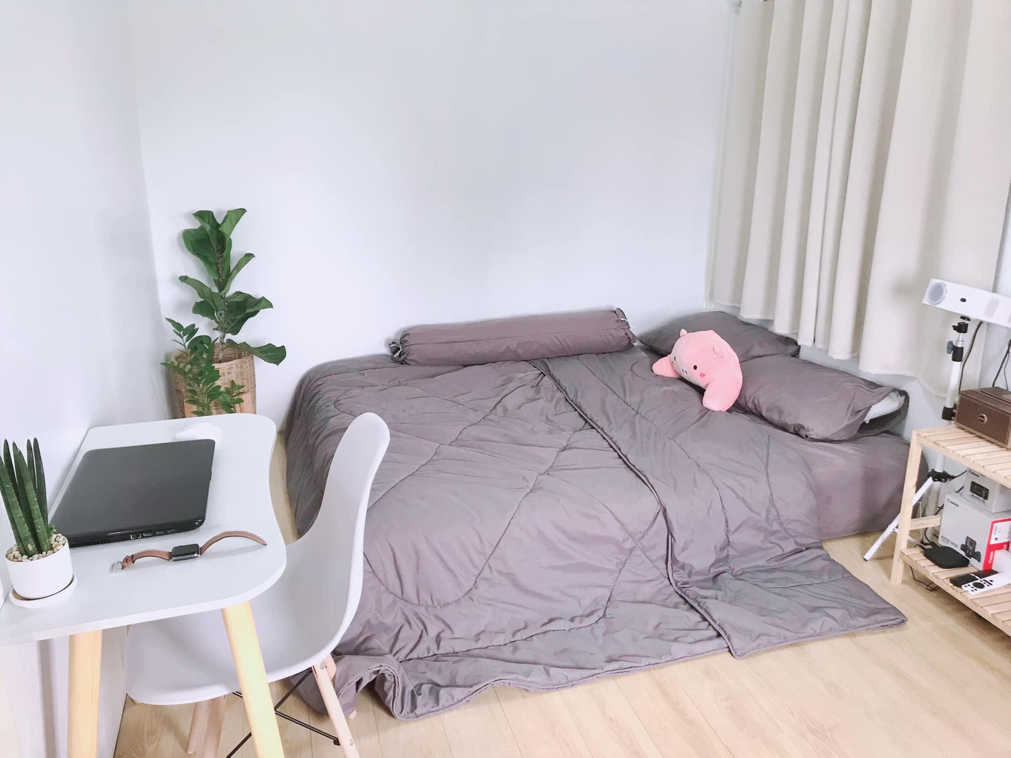 เพื่อให้ห้องมีความสดชื่น เจ้าของห้องจึงได้ตกแต่งภายในด้วยต้นไม้ขนาดเล็กที่สำหรับปลูกในอาคารได้ จึงให้สีเขียวและบรรยากาศที่สดชื่น