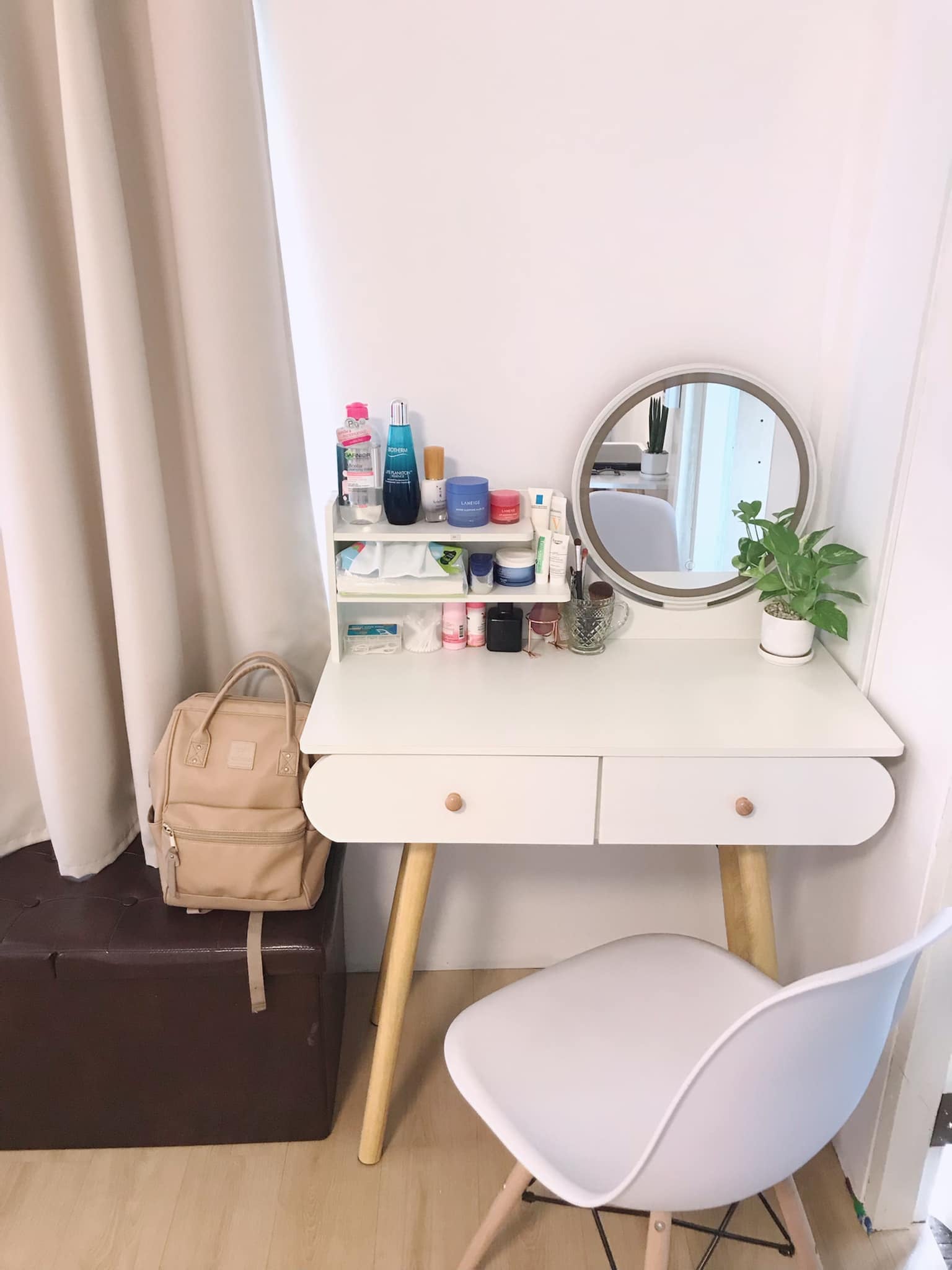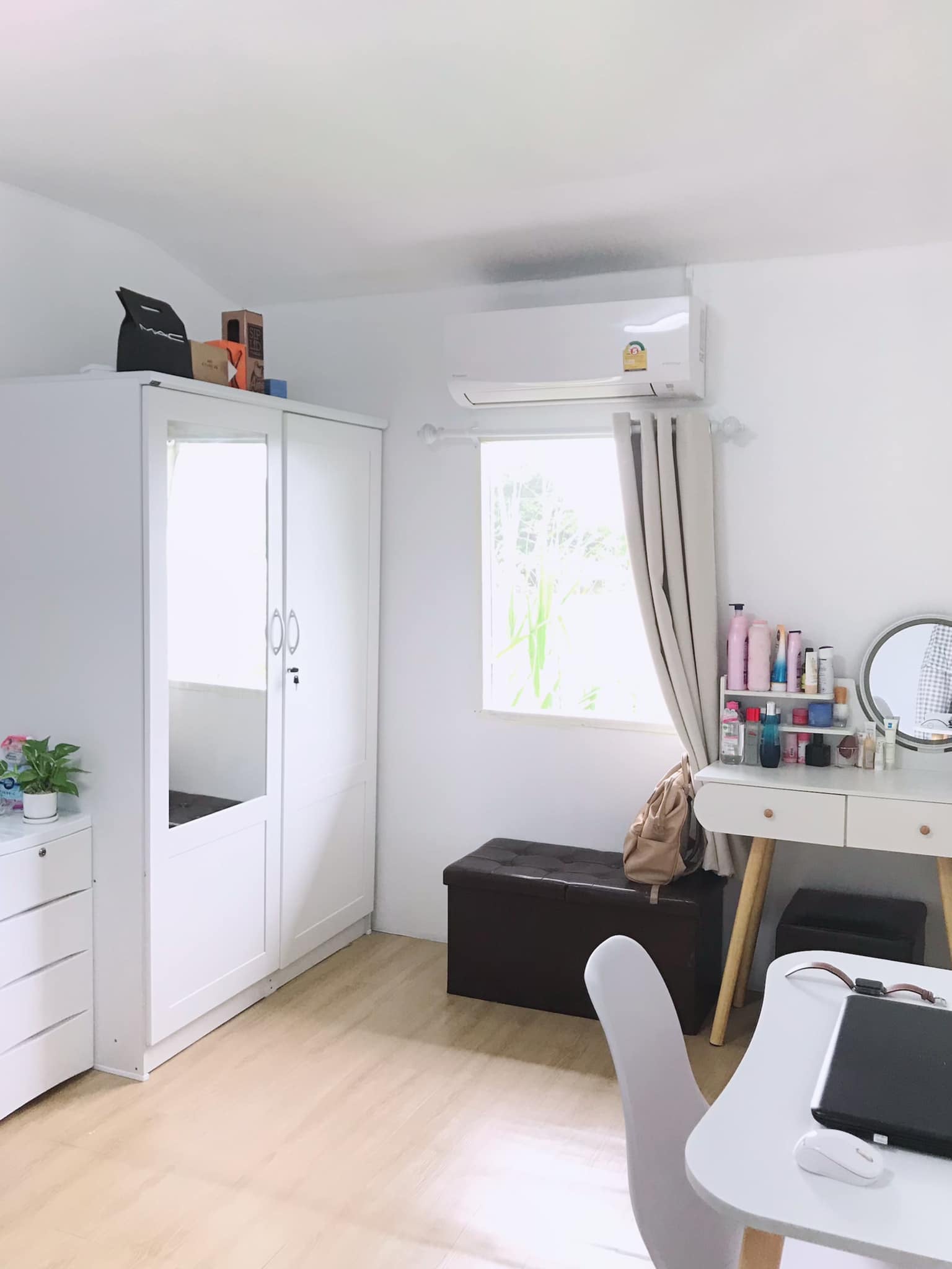 มุมโต๊ะเครื่องแป้งถูกจัดวางองค์ประกอบได้อย่างเรียบง่าย เพิ่มความสดชื่นด้วยต้นไม้ต้นเล็ก ๆ พร้อมกระจกทรงกลมที่เค้ากับสไตล์มินิมอลของห้อง