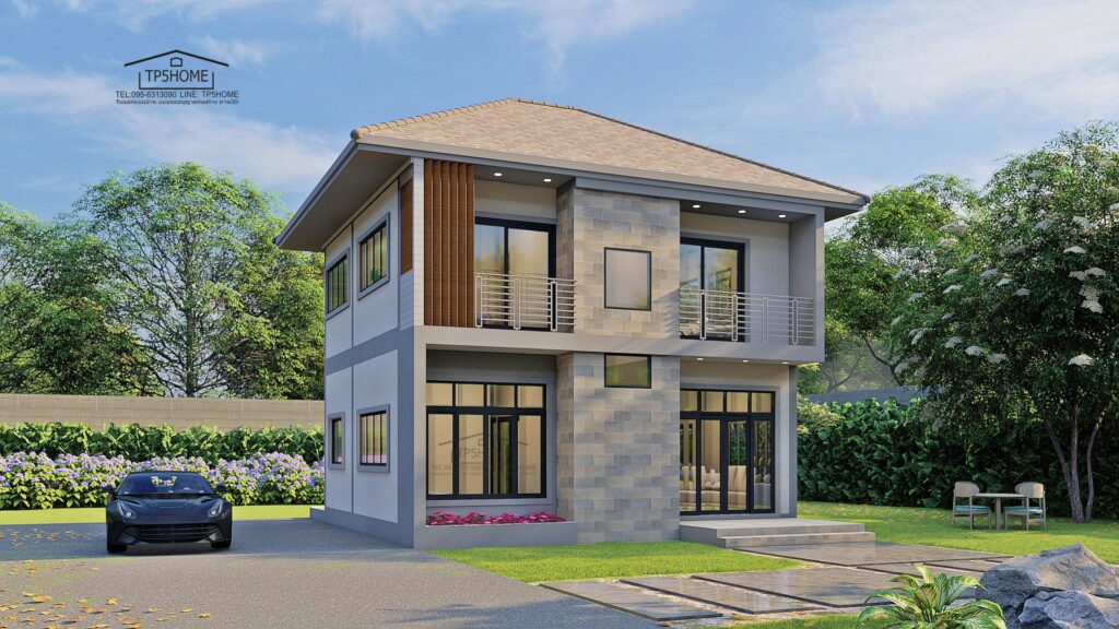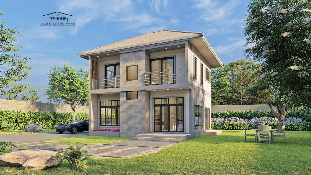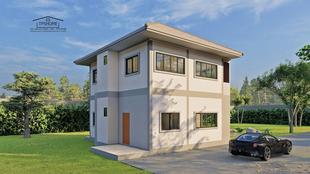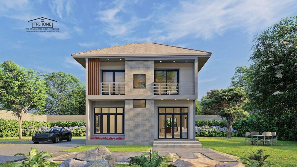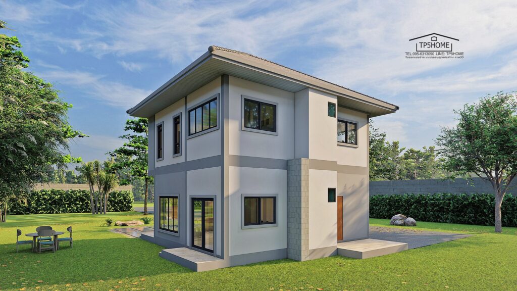 แบบบ้านสองชั้นสไตล์โมเดิร์น ผลงานการออกแบบโดยทีมงาน TP5Home ตกแต่งด้วยโทนสีขาว-เทา ให้ภาพลักษณ์ของบ้านที่สวยหรู บนรูปทรงที่เรียบง่าย ดูดี ดึงดูดสายตา เหมาะสำหรับครอบครัวขยายครับ