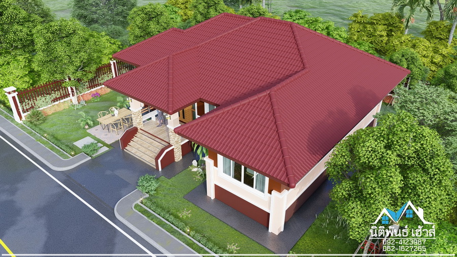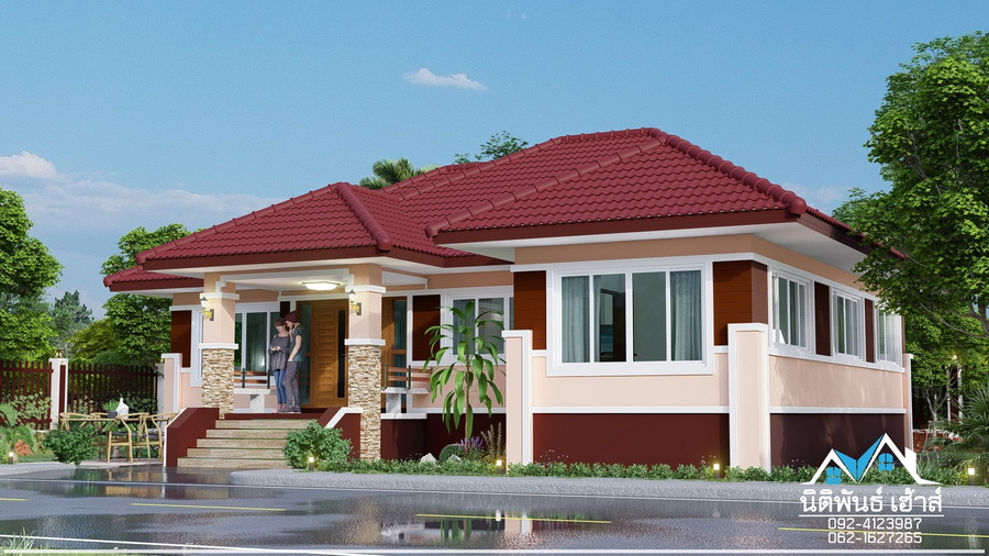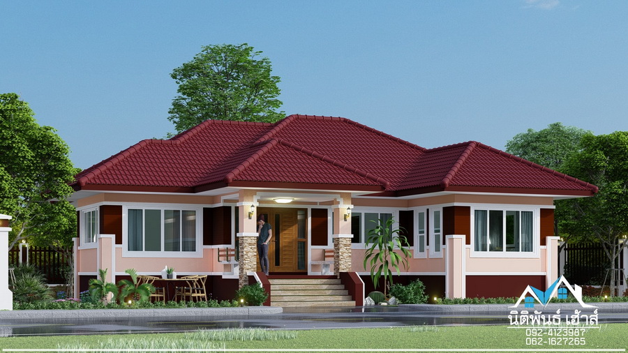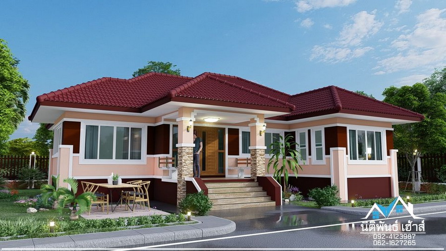 แบบบ้านหลังนี้เป็นบ้านชั้นเดียวที่ถูกออกแบบด้วยสไตล์แบบคอนเทมโพรารี ฐานของบ้านถูกยกขึ้นสูงเพื่อช่วยป้องกันปัญหาน้ำท่วมขังช่วงหน้าฝน ตัวบ้านมีลักษณะหน้ากว้าง ผนังภายนอกตกแต่งด้วยโทนสีอ่อน ผสานดทนสีเข้มอย่างสีน้ำตาล