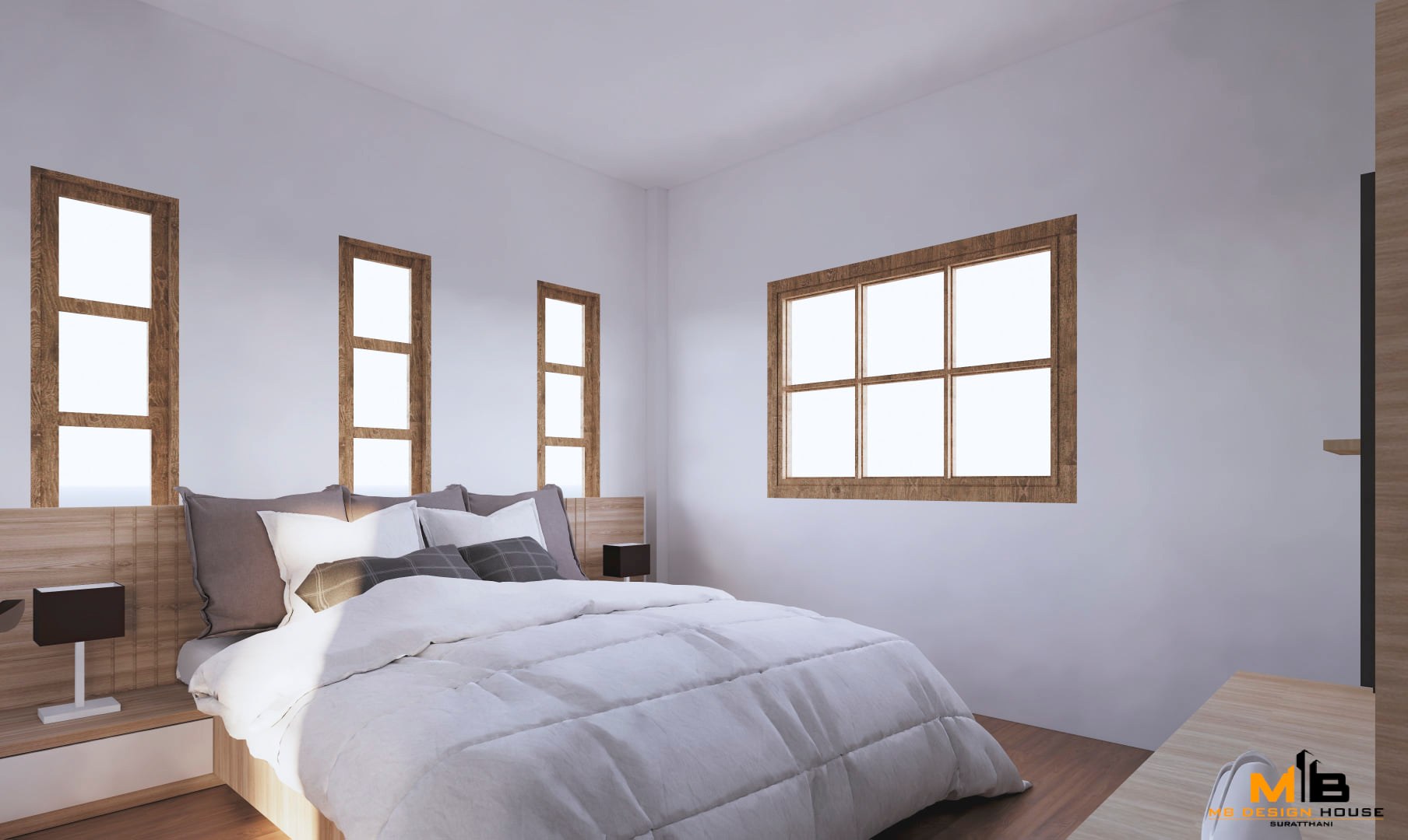 บรรยากาศภายในห้องนอนก็จะอบอวลไปด้วยความอบอุ่นสบายตา ซึ่งสะท้อนผ่านการตกแต่งด้วยผนังสีครีม รวมถึงองค์ประกอบจากงานไม้