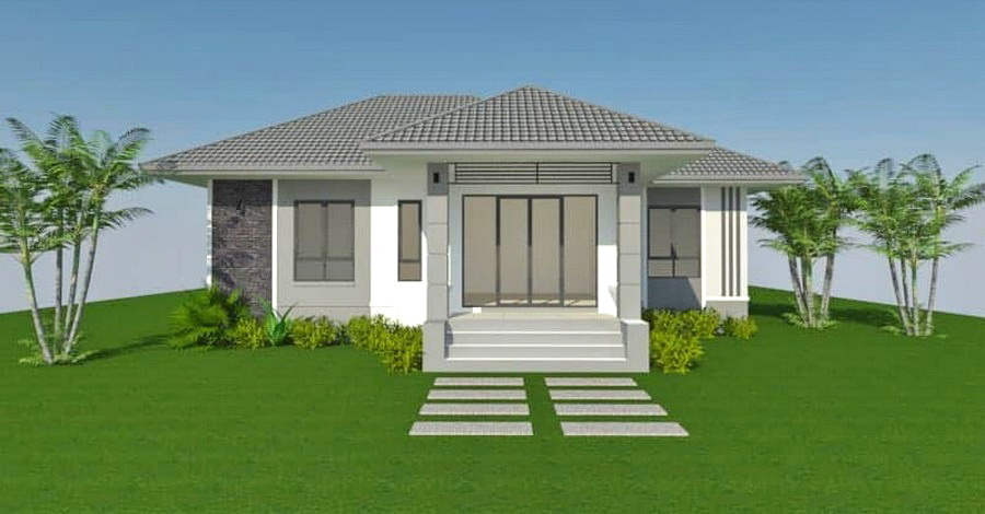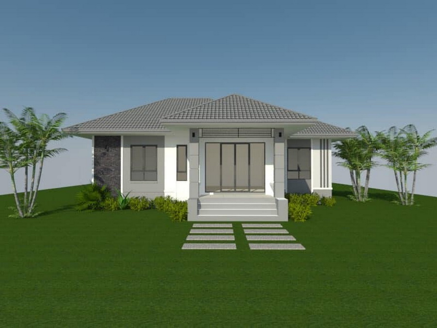 แบบบ้านหลังนี้เป็นแบบบ้านชั้นเดียวที่มีขนาดพอเหมาะ ตัวบ้านมีดีไซน์แบบคอนเทมโพรารี หรือบ้านทรงร่วมสมัย มีรายละเอียดการตกแต่งที่เรียบง่าย หลังคาออกแบบด้วยทรงปั้นหยาที่มุงด้วยกระเบื้องลอนเล็กสีเทา ผนังภายนอกตกแต่งกลมกลืนกับหลังคาด้วยสีขาวครีมและสีเทา