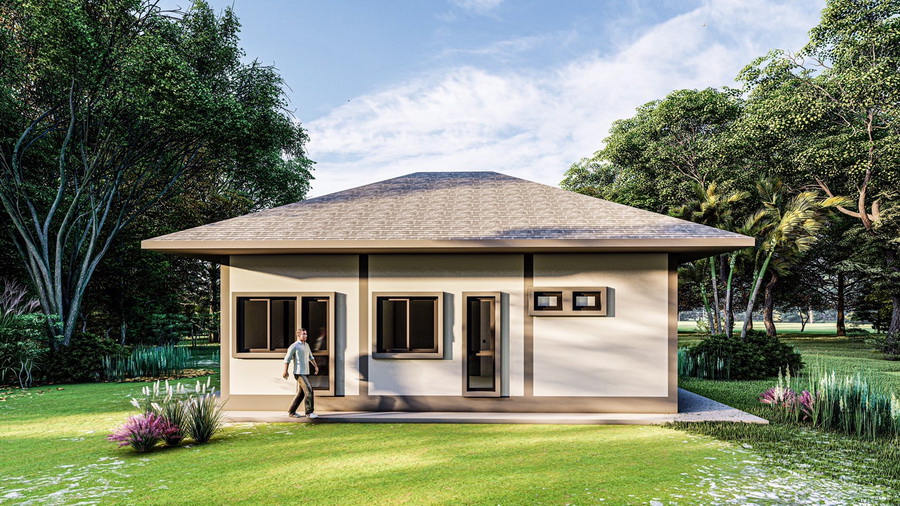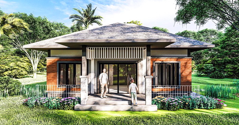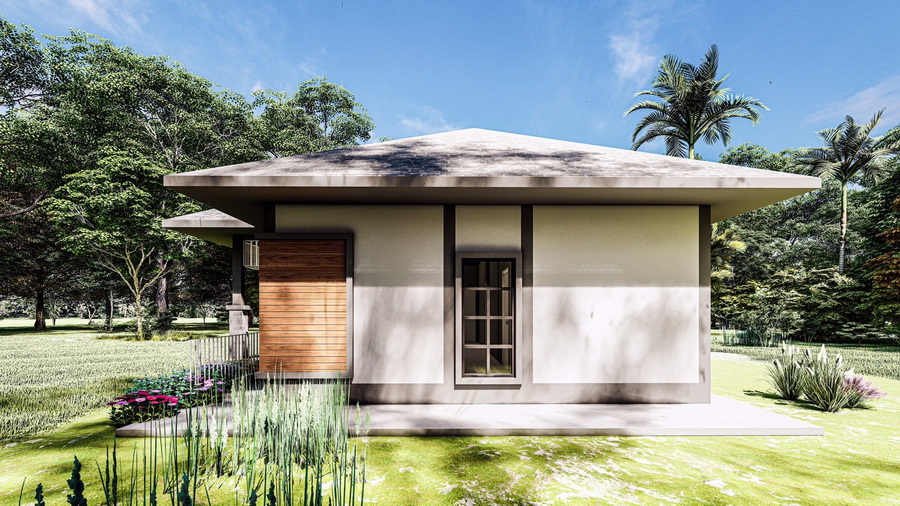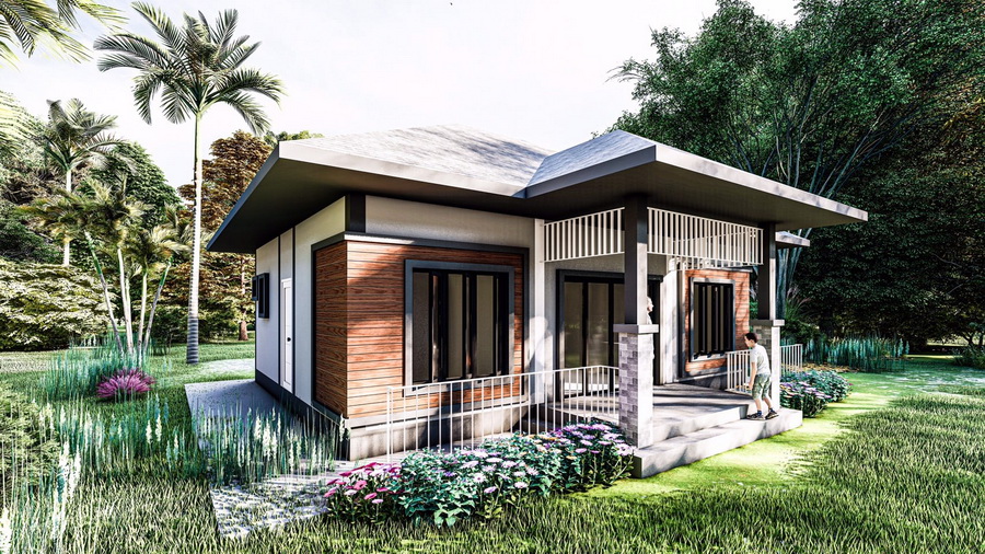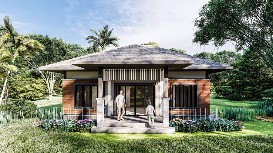 แบบบ้านหลังนี้เป็นบ้านขนาดชั้นเดียว ตัวบ้านมีดีไซน์และการตกแต่ที่เรียบง่ายตามแบบฉบับบ้านสไตล์คอนเทมโพรารี ด้านการตกแต่งนั้น ผนังภายนอกตกแต่งด้วยผนังไม้เทียมโทนสีน้ำตาล ผสานกับโทนสีเทาที่ให้กลิ่นอายแบบปูนเปลือยนิด ๆ มีหลังคาเป็นแบบปั้นหยาที่เข้ากันดีกับตัวบ้าน