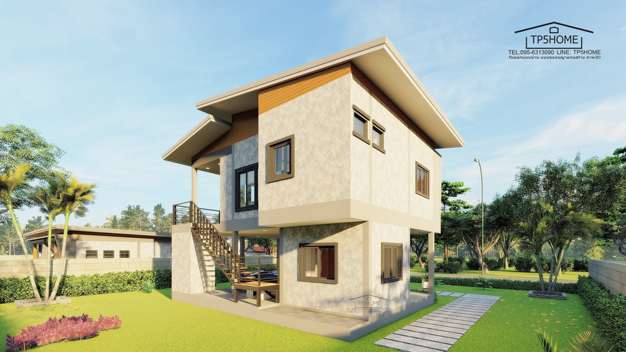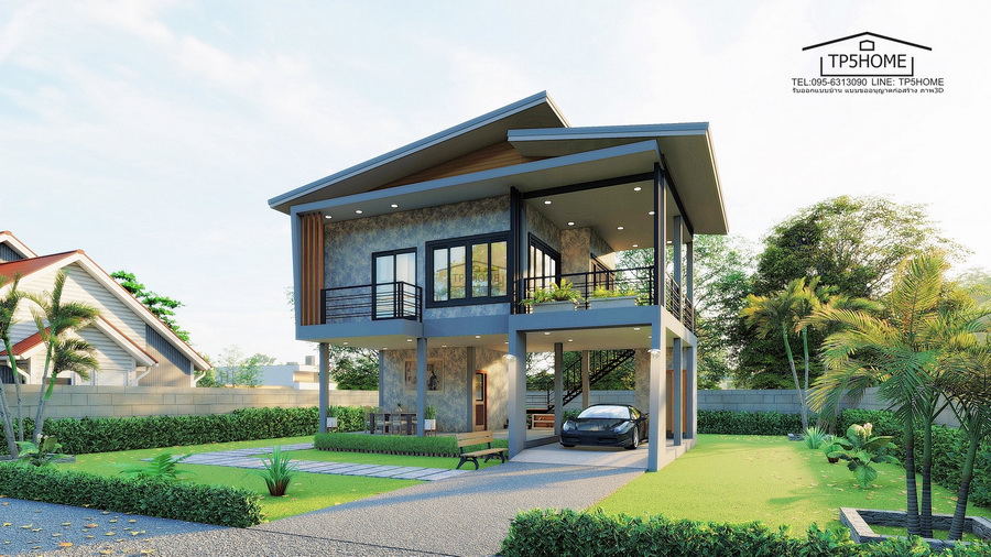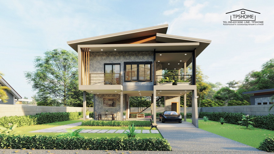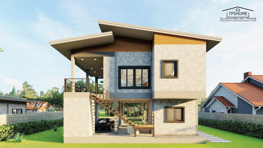 สำหรับแบบบ้านหลังนี้เป็นบ้านขนาดสองชั้น มีพื้นฐานการออกแบบในสไตล์โมเดิร์นที่เน้นความเรียบง่าย มีหลังคาทรงปีกนก ฐานของบ้านออกแบบเป็นใต้ถุนแบบยกสูง ทำให้ชั้นล่างโปร่งสบาย สามารถใช้เป้นพื้นที่สำหรับจอดรถ หรือทำกิจกรรมได้อย่างหลากหลาย