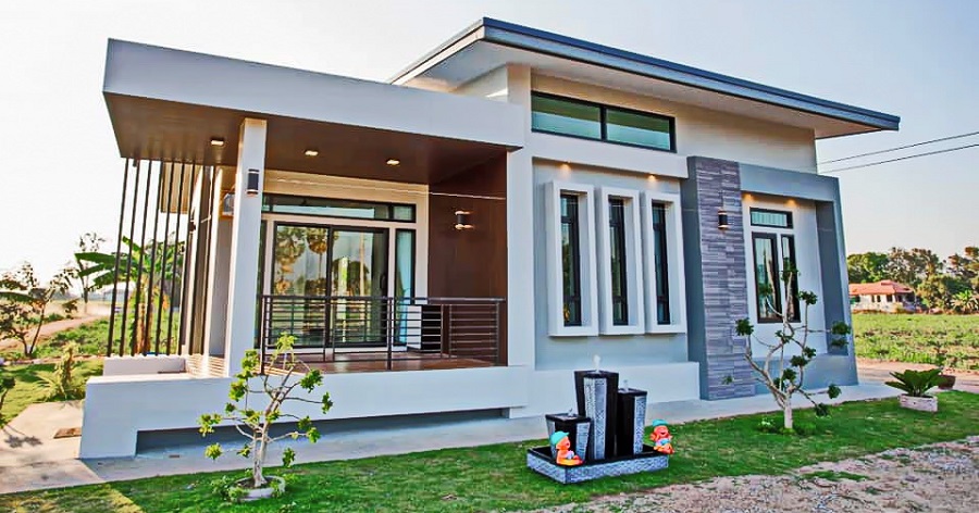 ลักษณะบ้านชั้นเดียว ดีไซน์ทรงกล่องสี่เหลี่ยม หลังคาทรงเพิงหมาแหงน มีเฉลียงขนาดพอเหมาะ ประตูบ้านเลือกใช้แบบกระจกเลื่อนได้ ส่วนหน้าต่างเลือกใช้ทรงสี่เหลี่ยมผืนผ้าที่มีทั้งแบบแนวตั้งและแนวนอน