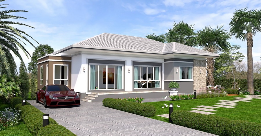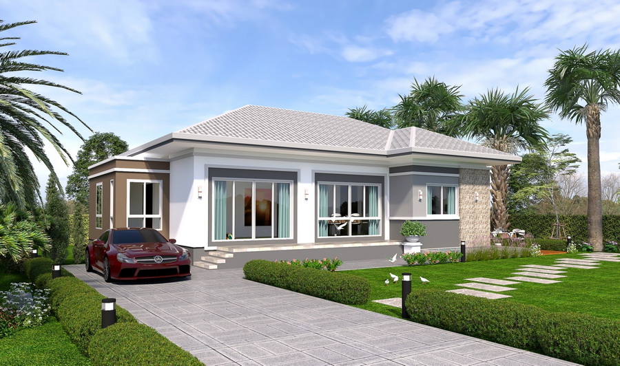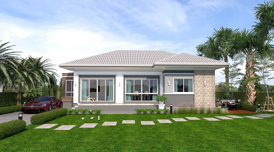 แบบบ้านหลังนี้เป็นแบบบ้านชั้นเดียว ฐานของบ้านถูกยกขึ้นสูง เป็นบ้านที่มีดีไซน์แบบคอนเทมโพรารีหน้ากว้าง ด้านการตกแต่งนั้น ตัวบ้านมีหลังคาทรงปั้นหยาที่มุงด้วยกระเบื้องลอนเล็ก ขณะที่ผนังทางด้วยสีขาวยืนพื้น แซมด้วยสีเทาและสีน้ำตาล