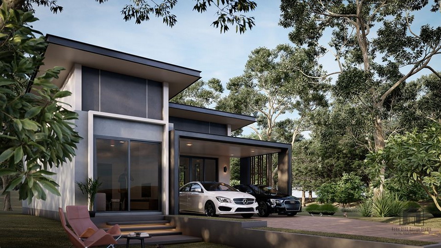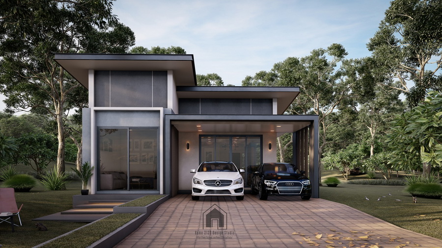 สำหรับแบบบ้านหลังนี้เป็นบ้านขนาดชั้นเดียว ตัวบ้านดีไซน์ทมรงโมเดิร์นเพดานยกสูง ความโดดเด่นจะอยู่ที่การออกแบบหลังทรงเพิงหมาแหงน ผนังภายนอกตกแต่งด้วยโทนสีครีมและเทา จึงให้บรรยากาศที่ดูสงบเย็นตา เป็นบ้านที่เหมาะกับคนยุคใหม่