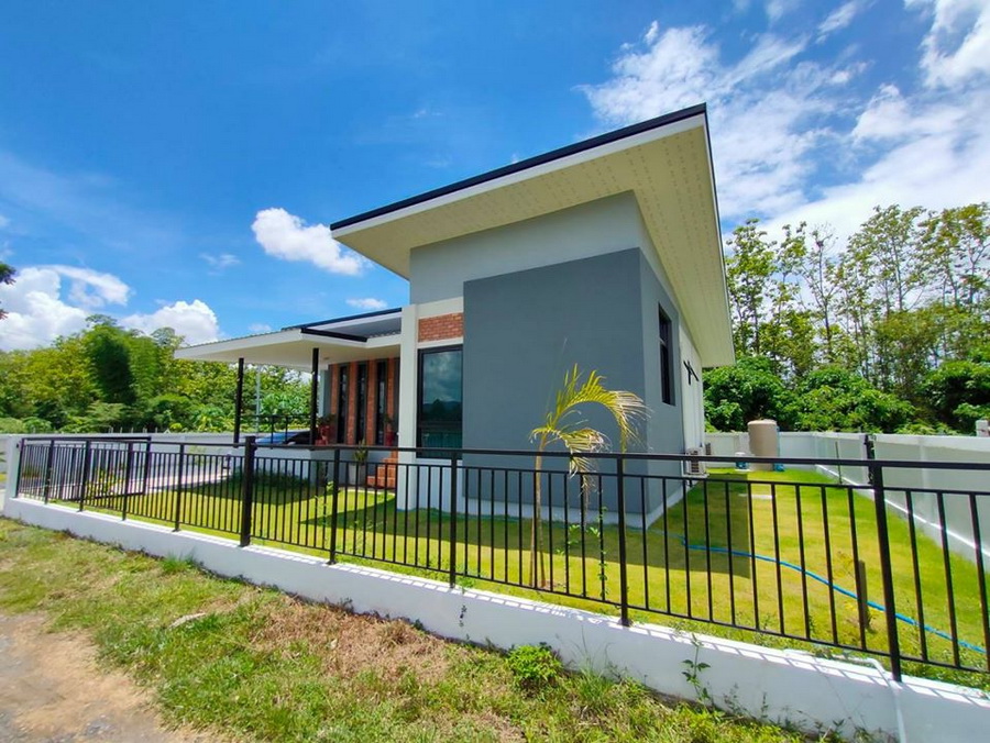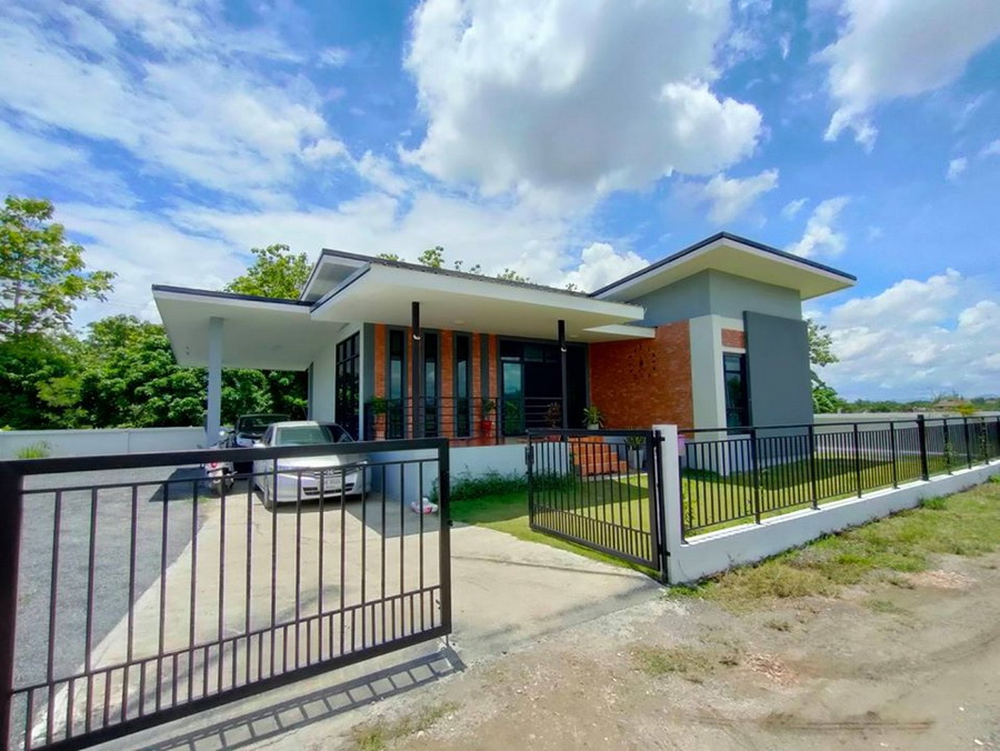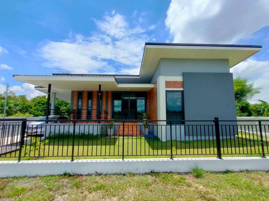 บ้านชั้นเดียวสไตล์โมเดิร์นรูปตัวตัวแอล (L-Shape House) 3 ห้องนอน 2 ห้องน้ำ 1 ห้องครัว 1 ห้องครัวและห้องรับประทานอาหาร 1 ห้องรับแขก 1 ที่จอดรถ ขนาด 129 ตารางเมตร งบก่อสร้างอยู่ที่ประมาณ 1.20 ล้านบาท