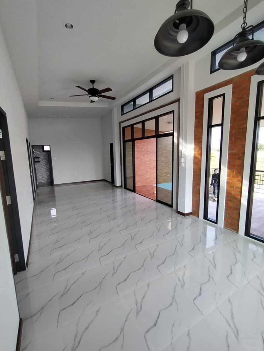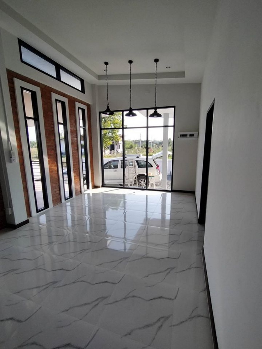 เมื่อเข้ามาภายในบ้าน เราจะพบกับห้องโถงกว้างในแนวยาว ผนังภายในตกแต่งด้วยสีขาวทำให้ห้องดูสว่างและมีมิติ พร้อมกับการตกแต่งด้วยโคมไฟแบบอินดัสเทรียลแบบสวยดิบ