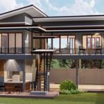ตัวบ้านชั้นเดียว หลังคาทรงจั่วซ้อนกันสองชั้น มุงด้วยกระเบื้องโทนสีน้ำตาล ตกแต่งผนังภายนอกด้วยโทนสีขาว แทรกไปด้วยรายละเอียดของอิฐโชว์แนวสีขาวจากเสาหน้าบ้านและทางขึ้นเฉลียง พื้นที่รอบ ๆ ถูกออกแบบให้เป็นสวนสีเขียว เข้ากับดีไซน์บ้านที่ดูน่ารักอบอุ่นได้เป็นอย่างดี