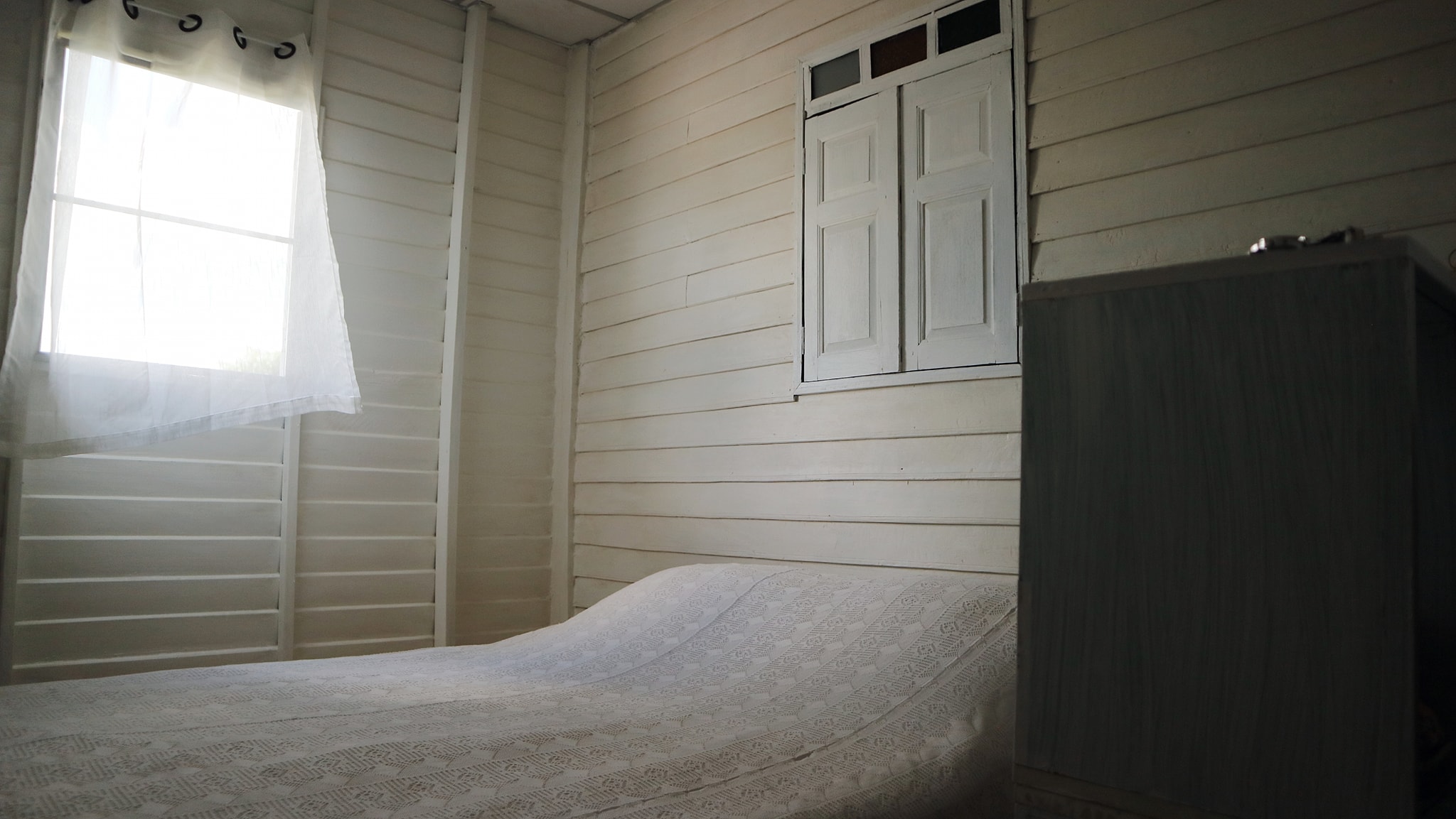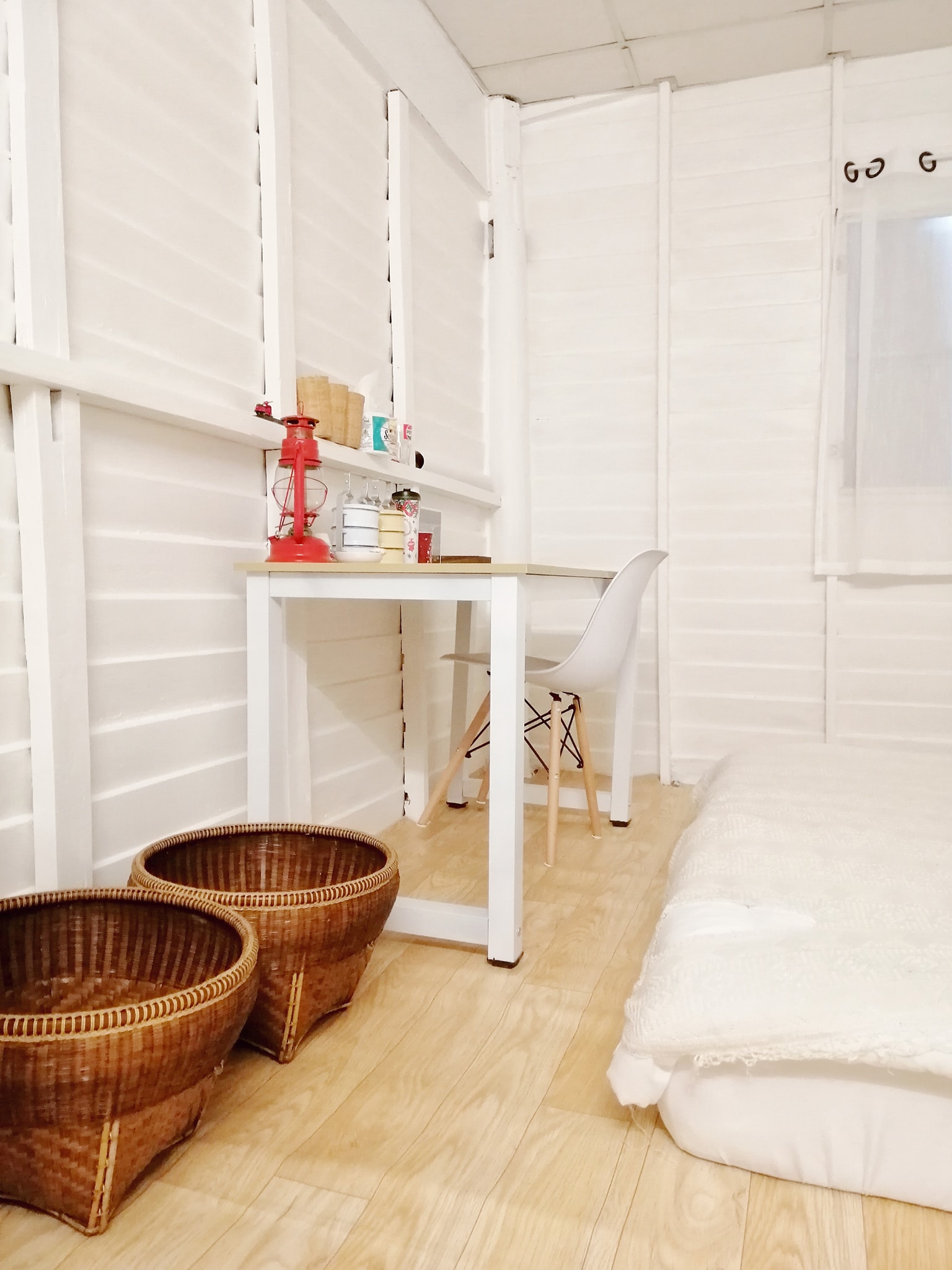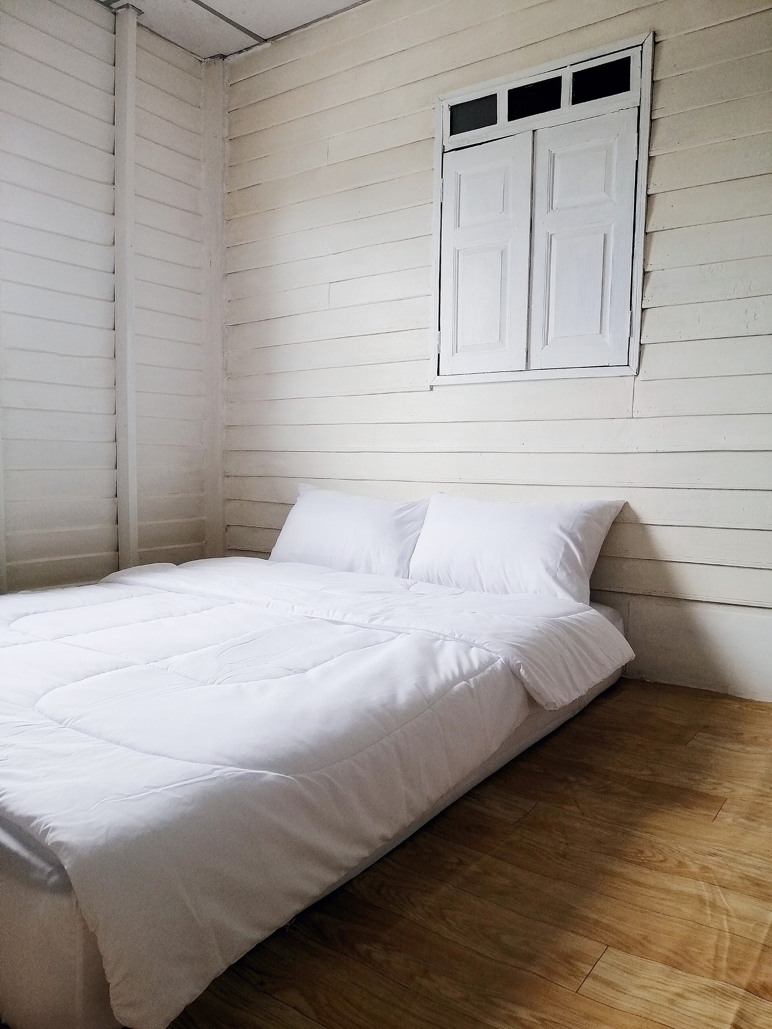 บริเวณเตียงนอนติดกับหน้าต่าง ซึ่งถูกทาในโทนสีขาวทั้งหมด