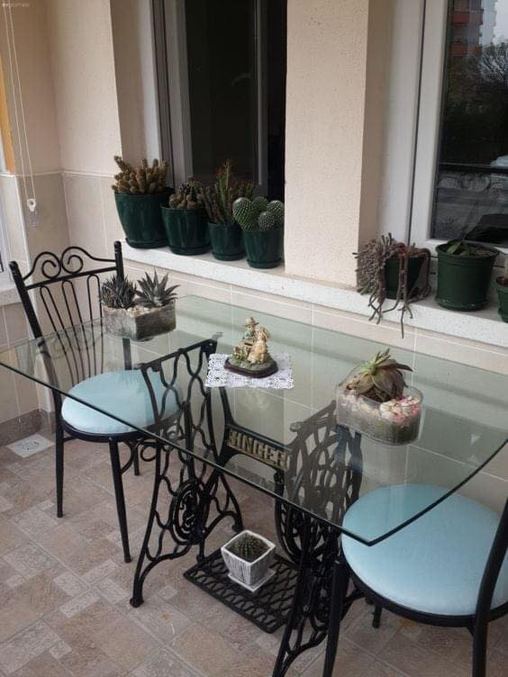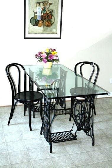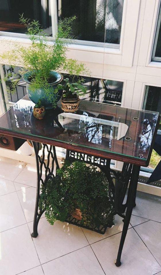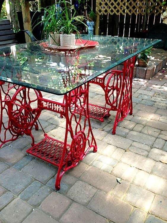 10. โต๊ะกระจกที่โดดเด่นด้วยจักรเย็บผ้าสีแดงสด