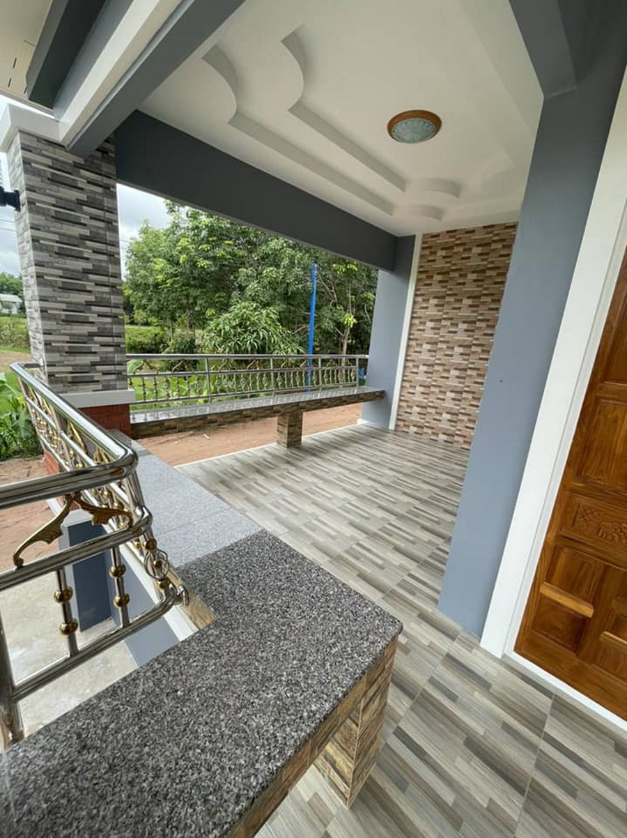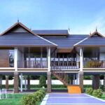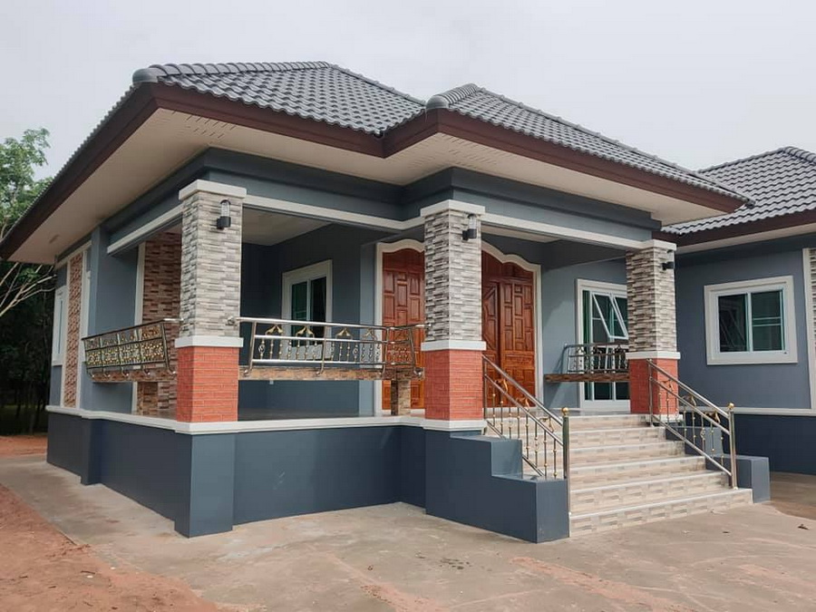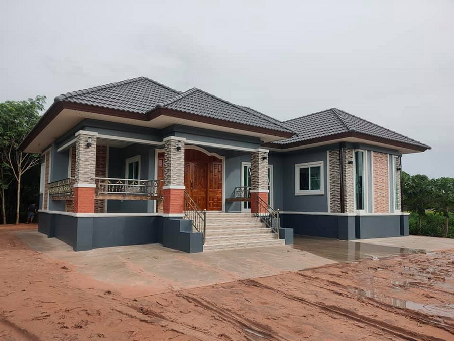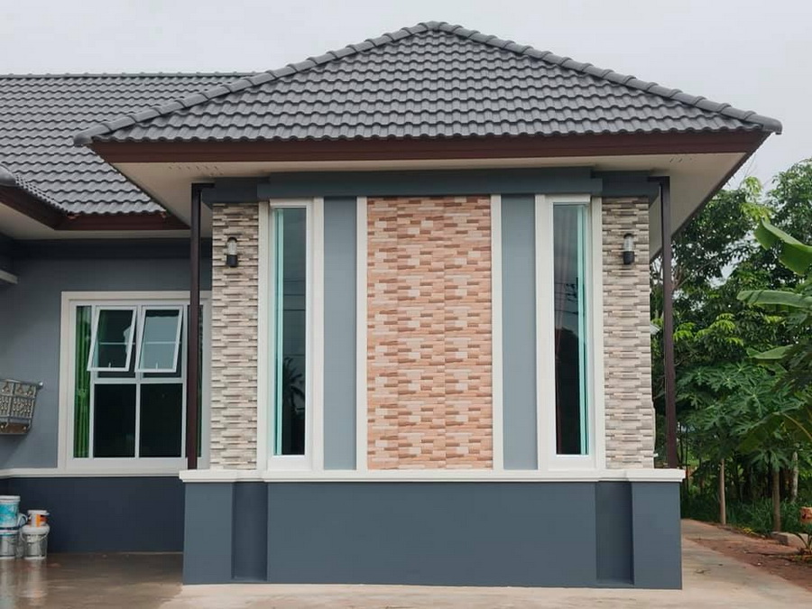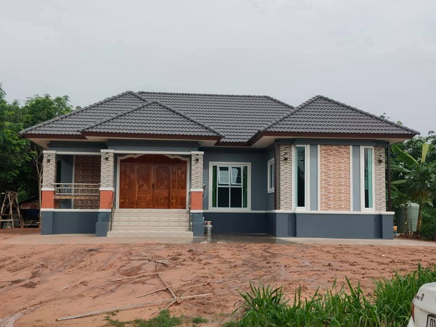 บ้านหลังนี้เป็นบ้านชั้นเดียว ฐานของบ้านถูกยกขึ้นสูง จึงป้องกันปัญหาน้ำท่วมขังในหน้าฝนได้เป็นอย่างดี งานหลังคานั้น เป็นหลังคาทรงปั้นหยาที่มุงด้วยกระเบื้องลอนสีเข้ม ในขณะที่ผนังภายนอกตกแต่งในโทนสีออกเทา เพิ่มดีเทลจากสีขาวและสีน้ำตาลให้บ้านดูมีชีวิตชีวา