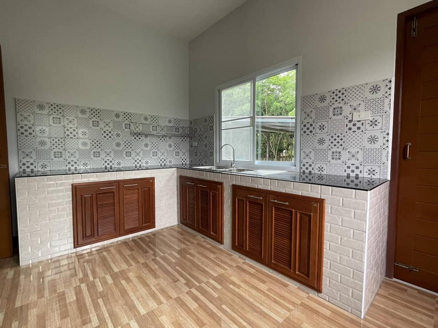 เช่นเดียวกันกับห้องครัวที่ภายในยังคงมีพื้นที่กว้าง ระบายอากาศได้ดีด้วยหน้าต่างขนาใหญ่ที่ติดกับเคาน์เตอร์ครัวแบบติดผนัง