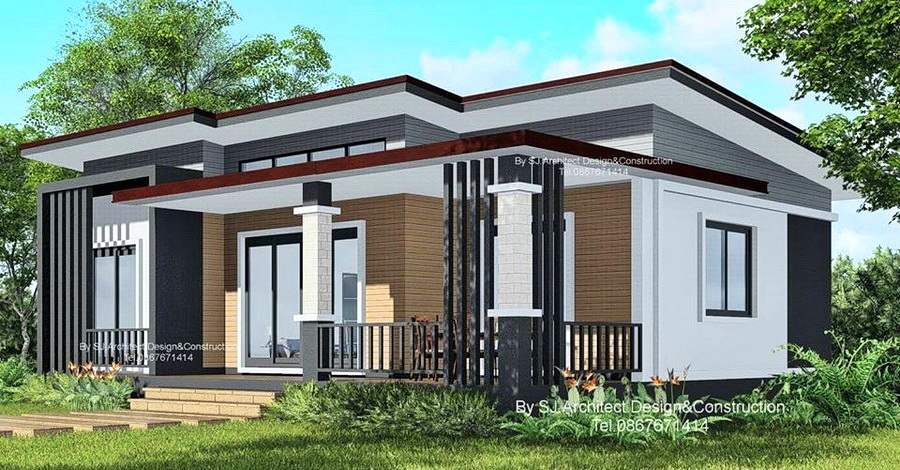 สำหรับแบบบ้านหลังนี้เป็นบ้านสไตล์โมเดิร์นขนาดชั้นเดียว ตัวบ้านถูกออกแบบในลักษณะหน้ากว้าง ด้านการตกแต่งนั้น หลังคาของบ้านออกแบบในรูปทรงเพิงหมาแหงน ผนังภายนอกตกแต่งในโทนสีขาว เทา และน้ำตาลที่ผสานกันอย่างลงตัว