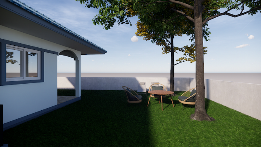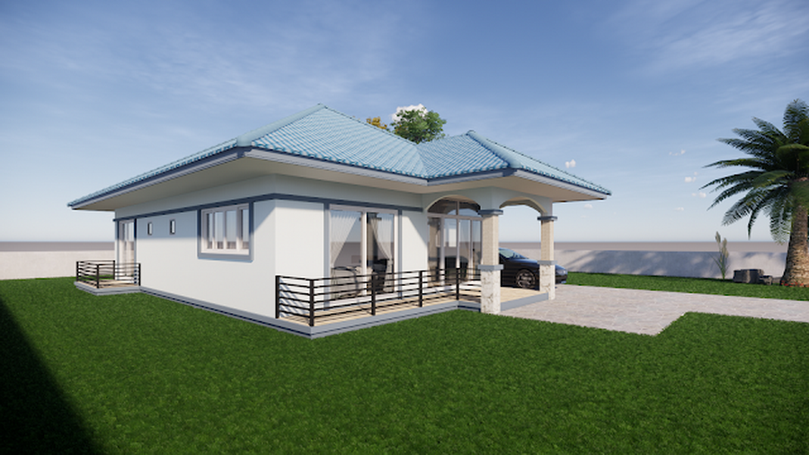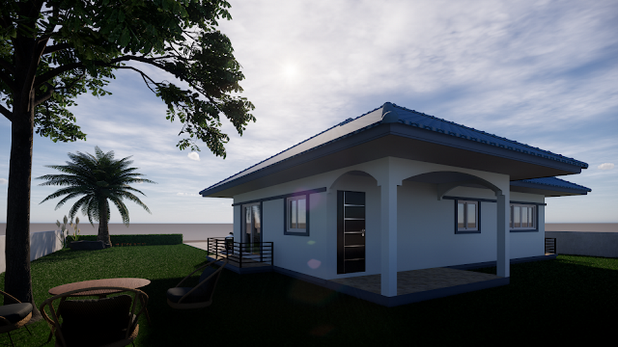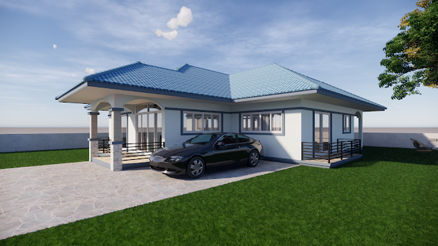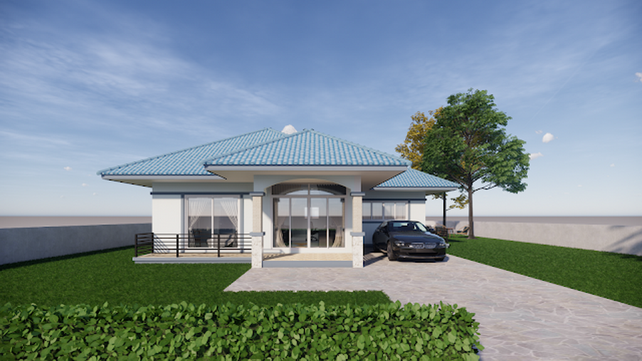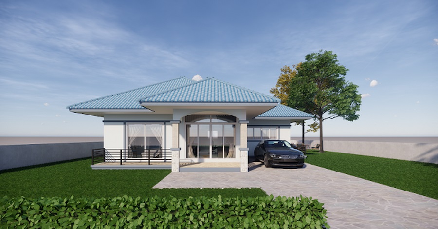 แบบบ้านหลังนี้เป็นบ้านสไตล์คอนเทมโพรารีชั้นเดียวแบบหน้ากว้าง การออกแบบจะเน้นที่ความเรียบง่าย เพื่อให้ก่อสร้างได้ง่าย ประหยัดงบประมาณ ความโดดเด่นอยู่ที่การออกแบบหลังคาทรงปั้นหยาในโทนสีฟ้าจากกระเบื้องลอน ผนังภายนอกเลือกใช้สีขาวครีมที่ให้ความสว่าง
