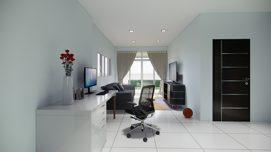 เมื่อเข้ามาภายในบ้าน เราจะพบกับห้องโถงหลักที่มีพื้นที่ใช้สอยกว้างขวาง โดยได้แบ่งพื้นที่เป็นห้องนั่งเล่นและพื้นที่สำหรับนั่งทำงาน