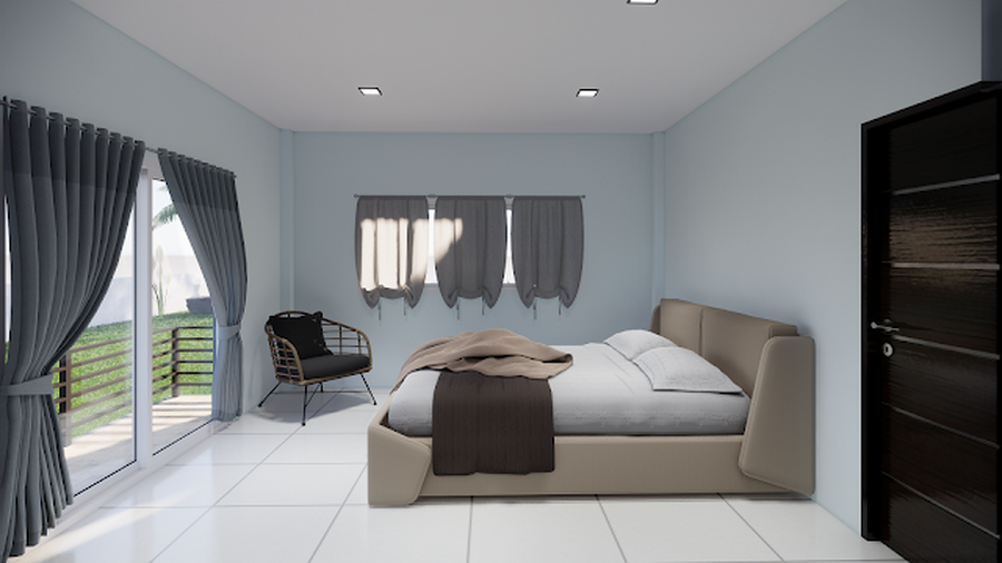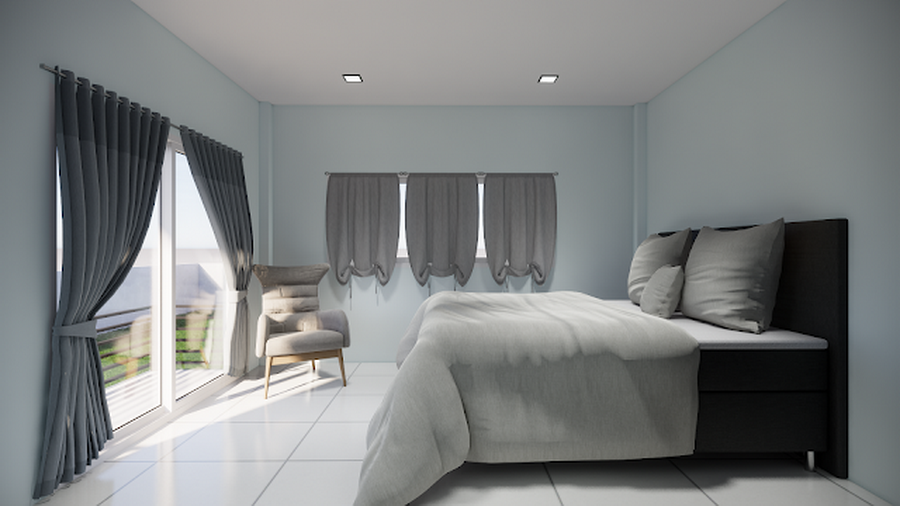 ทางด้านของห้องนอนก็มีความเรียบง่ายไม่แพ้กัน โดยจะเน้นที่ความโปร่งสบาย ด้านข้างมีประตูกระจกบานเลื่อนที่เชื่อมต่อไปยังระเบียงนอกบ้าน