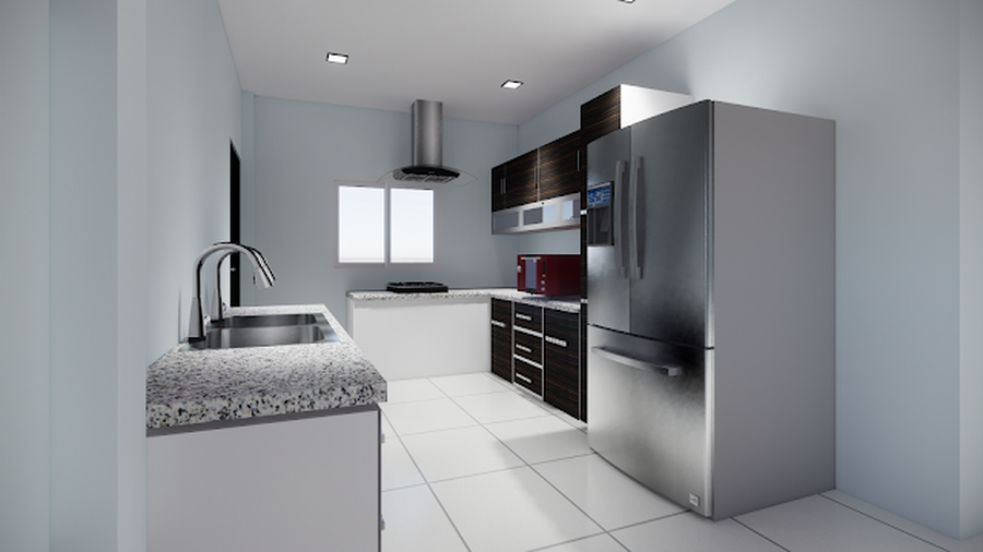 ห้องครัวเป็นอีกพื้นที่หนึ่งที่มีความกว้างขวาง ภายในครัวออกแบบในสไตล์แบบโมเดิร์น จึงมีสิ่งอำนวยความสะดวกที่ครบถ้วนสะดวกต่อการใช้งาน