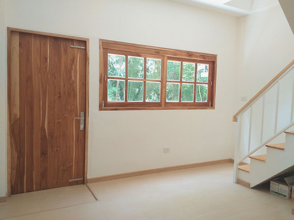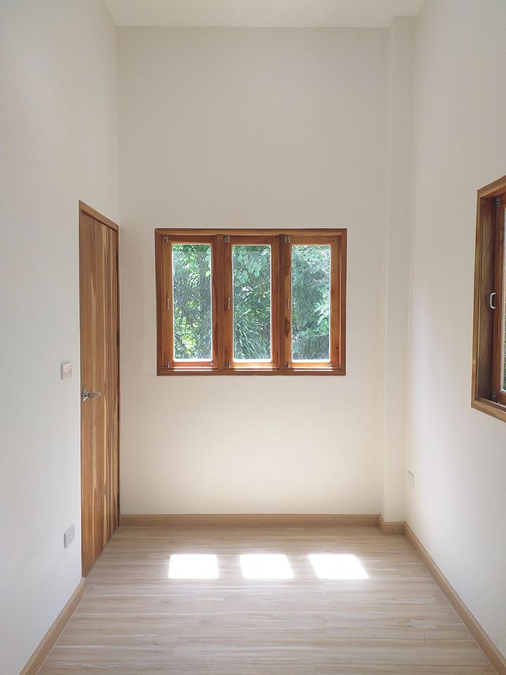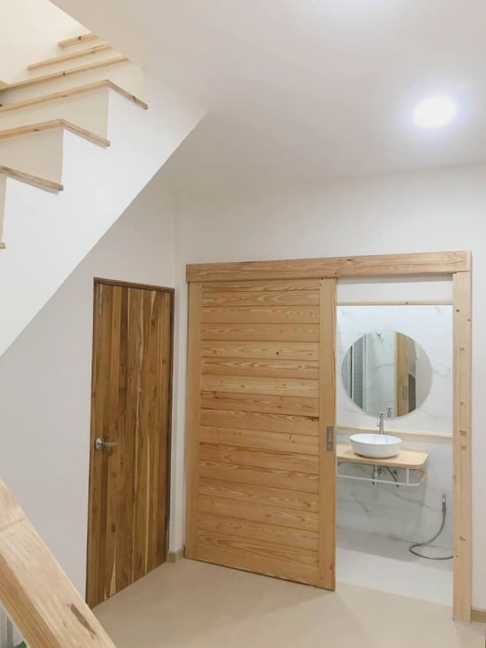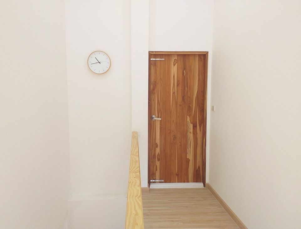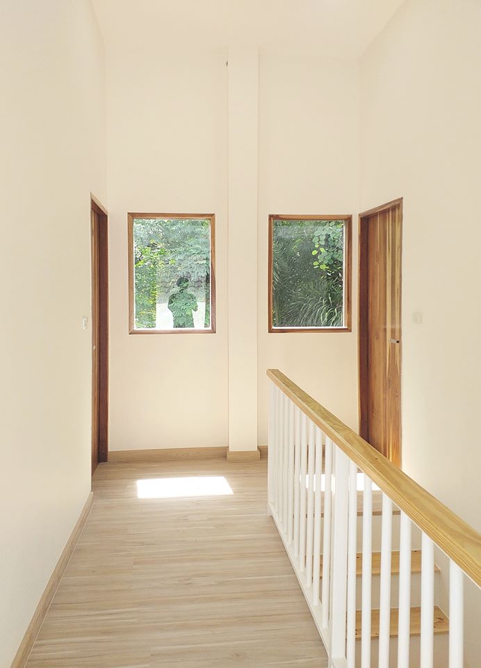วัสดุสำหรับองค์ประกอบภายในส่วนใหญ่จะเป็นไม้ทั้งหมด ไม่ว่าจะเป็นบันได ประตู หน้าต่าง และพื้น เมื่อผสานกับพื้นหลังโทนสีขาวแล้ว เรียกได้ว่าเป็นไอเดียการตกแต่งที่เรียบง่าย แต่ได้ความสวยงามไปเต็ม ๆ เลยทีเดียว