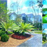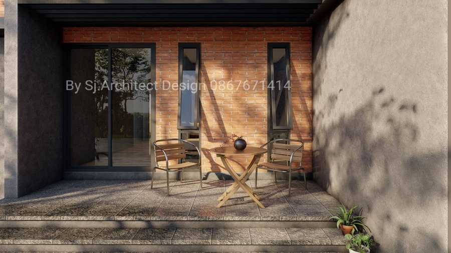 บริเวณหน้าบ้านถูกออกแบบให้มีเฉลียงกว้างเอาไว้ เพื่อที่จะสามารถตกแต่งและจัดให้เป็นมุมนั่งเล่น นั่งดื่มกาแฟยามเช้านอกบ้านได้อย่างผ่อนคลาย
