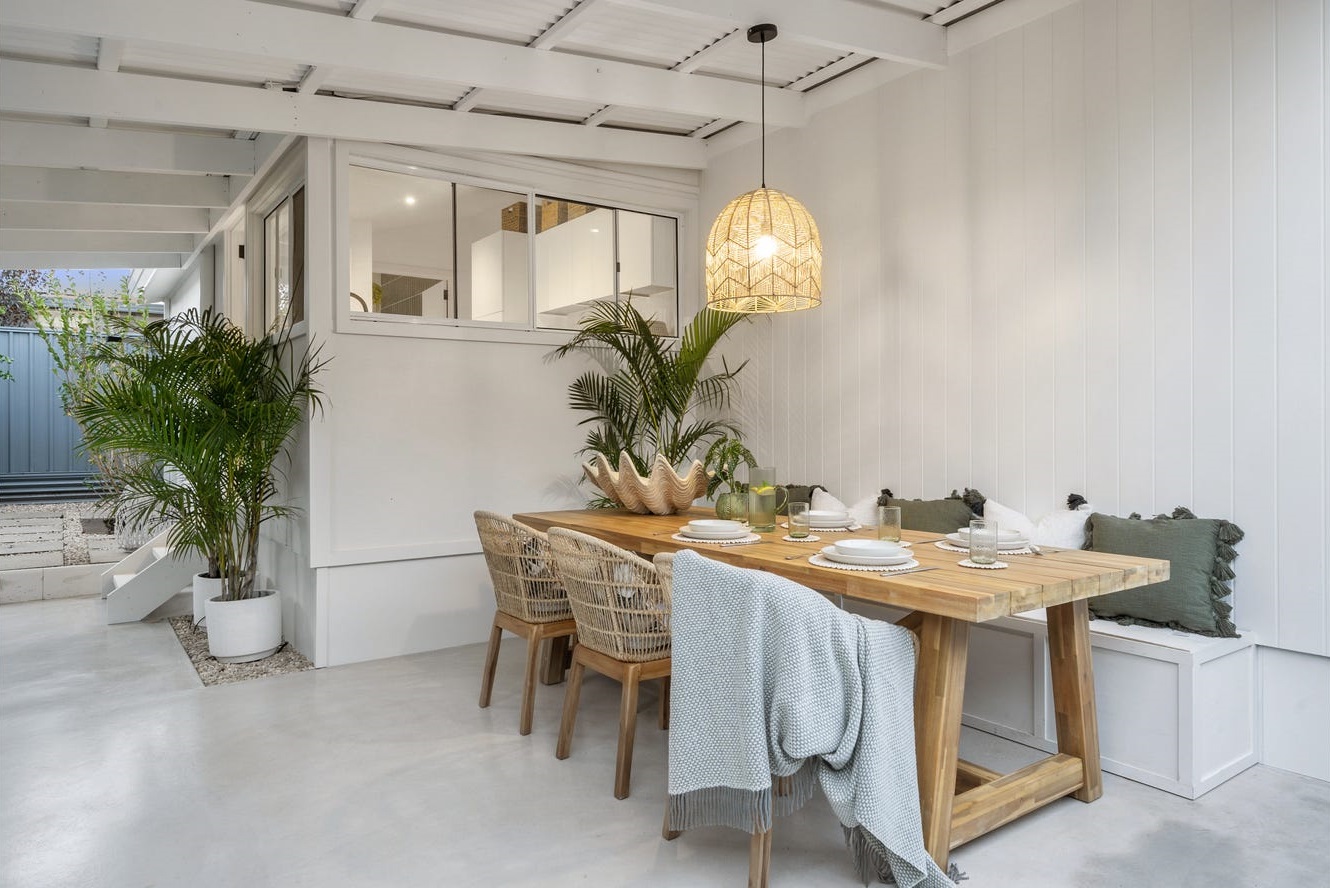 ในส่วนของพื้นที่ด้านหลังบ้าน ก็จะมีลานในร่มอีกแห่งหนึ่ง ซึ่งถูกใช้ให้เป็นพื้นที่สำหรับรับประทานอาหารนอกบ้าน เพื่อสร้างบรรยากาศดี ๆ ให้กับครอบครัว