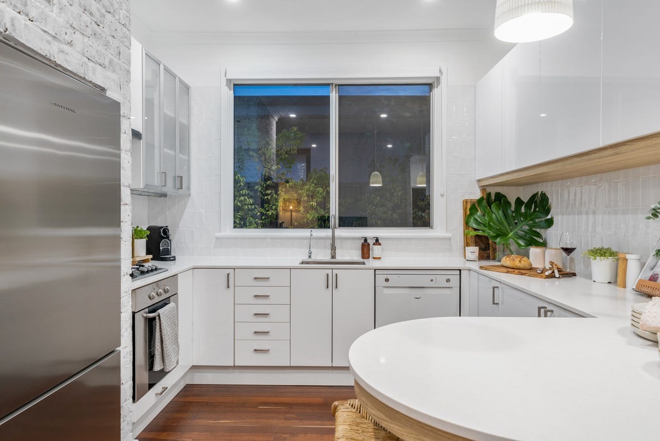 ด้านหลังของมุมนั่งเล่น ก็จะเป็นห้องครัวแบบตะวันตก ซึ่งมีพื้นที่ใช้สอยได้ทุกด้าน เหมาะกับการประกอบอาหารเมนูง่าย ๆ