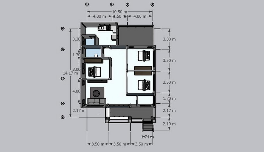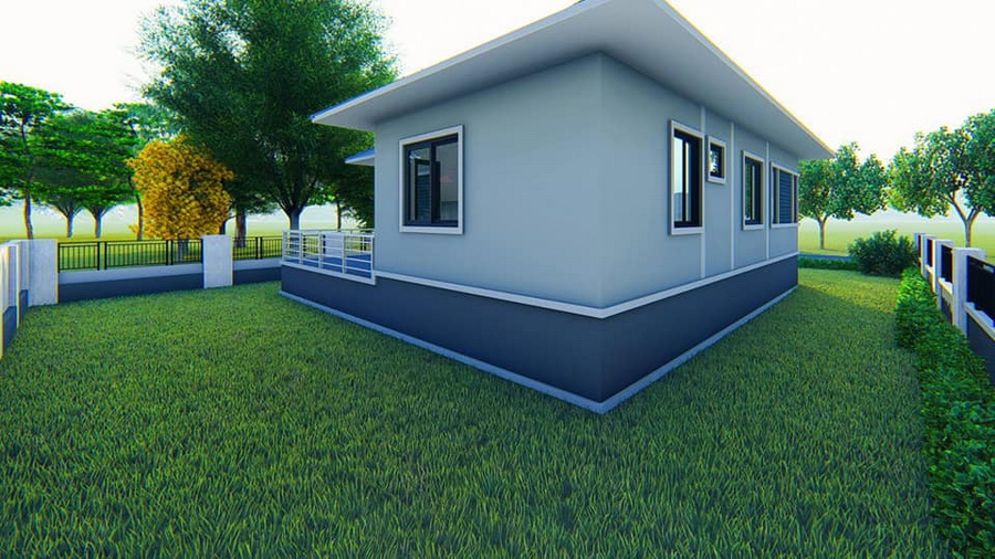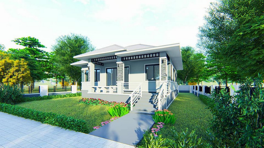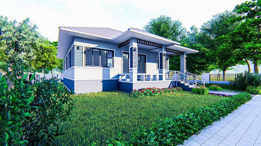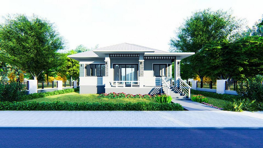 แบบบ้านหลังนี้เป้นบ้านชั้นเดียว ฐานของบ้านถูกยกขึ้นสูง ตัวบ้านมีดีไซน์ที่เรียบง่ายในแบบคอนเทมโพรารี ตกแต่งด้วยหลังคาทรงปั้นหยาที่มุงด้วยกระเบื้องลอนเล็ก ด้านการตกแต่งนั้น ผนังภายนอกเลือกใช้โทนสีขาวครีม จึงทำให้บ้านดูสว่างสวยงาม