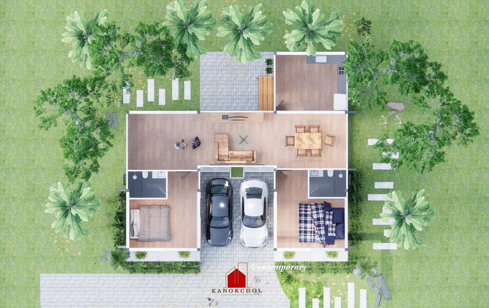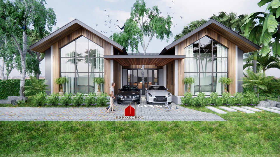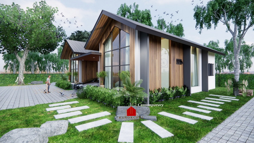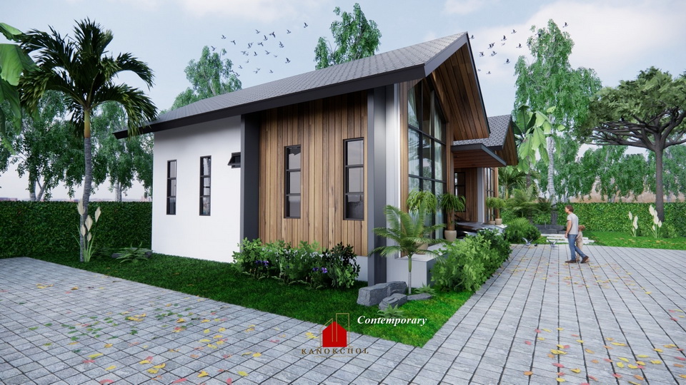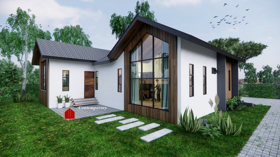 แบบบ้านชั้นเดียวแนวคอนเทมโพรารี ผลงานการออกแบบโดยทีมงานจาก บริษัท กนกชลคอนสตรัคชั่น จำกัด บ้านร่วมสมัยที่ผสมผสานความอบอุ่นของธรรมชาติ เข้ากับเส้นสายการออกแบบตัวอาคารที่ทันสมัย จัดสรรพื้นที่ภายในอย่างเรียบง่ายบนพื้นที่หน้ากว้างขนาด 140 ตารางเมตร