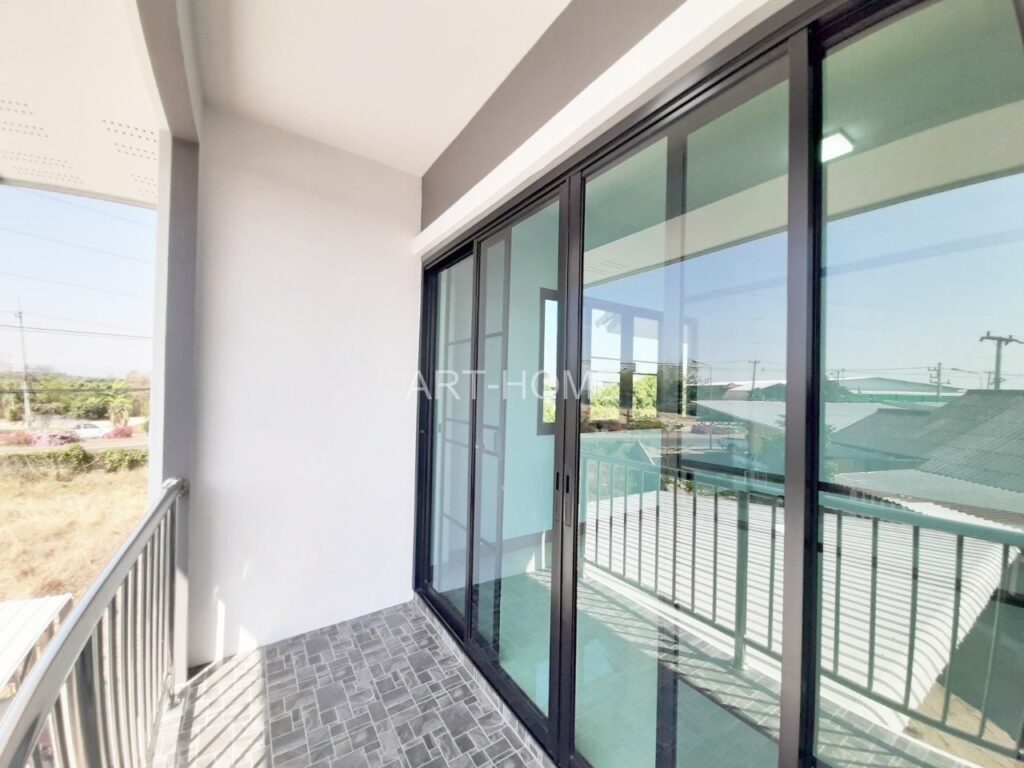 ประตูและหน้าต่างเลือกใช้กระจกโปร่งใสตัดแสง จึงช่วยให้พื้นที่ในบ้านได้รับแสงธรรมชาติแต่ก็ไม่ทำให้ภายในร้อนจนเกินไป อีกทั้งยังช่วยเพิ่มภาพลักษณ์ที่ทันสมัยให้กับภาพรวมของบ้านหลังนี้